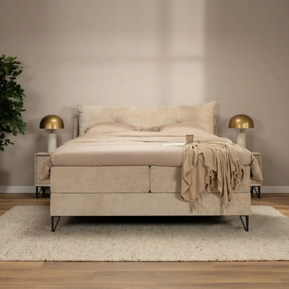 Maak kennis deze unieke Lazy ! Deze prachtige boxspring set heeft een gaaf hoofdbord met een groot kussen dat bevestigd zit met klittenband. De boxspring is voorzien van 2x HR Comfortschuim onderboxen, 2x 360 m2 pocketveer matrassen en een Full Hybrid topmatras. Deze gave boxspring staat op trendy, metalen pootjes.