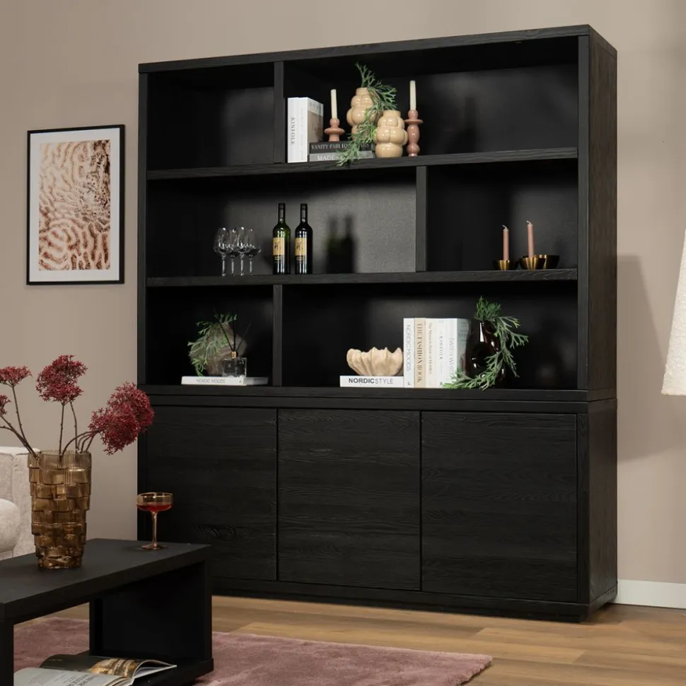Maak kennis met onze stijlvolle woonserie Saalbach van topkwaliteit! Uniek in zijn soort en exclusief verkrijgbaar bij Haco wonen en slapen! Deze serie meubels hebben een luxe en tijdloze uitstraling. De kasten zijn gemaakt van grenen hout en uitgevoerd in een stoere zwarte kleur. De deuren zijn greeploos en makkelijk te openen door middel van het push-open systeem. Met de open vakken van de kasten heb je voldoende ruimte om leuk te decoreren voor bijvoorbeeld; fotolijstjes, boeken, souvenirs en natuurlijk de meest trendy accessoires. Mix and match de verschillende meubels en ga voor dat lekkere thuisgevoel !