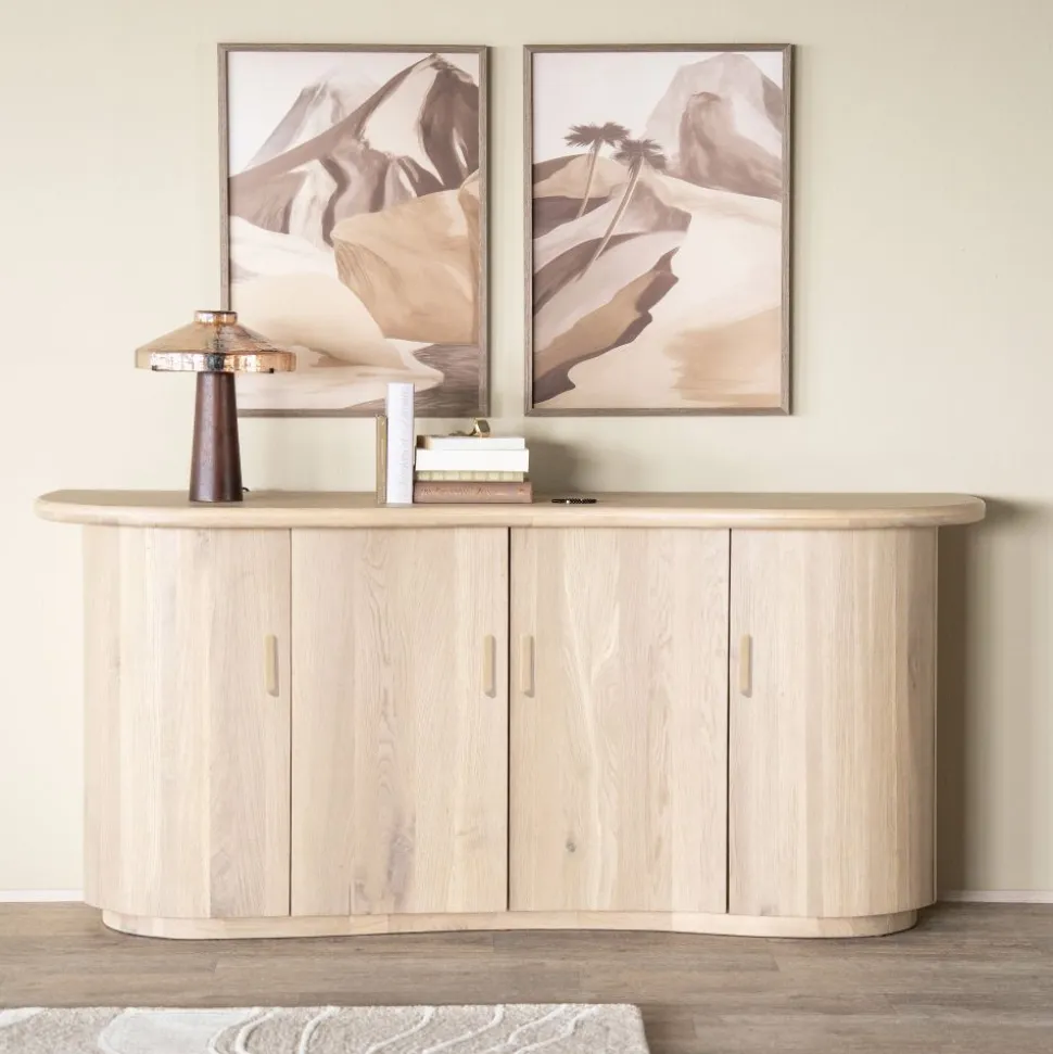 Dressoir Josh schittert door zijn natuurlijke uitstraling, mede dankzij de combinatie van massief eiken en hoogwaardig eikenfineer. De subtiele golfvorm in de voorzijde geeft het dressoir een elegante, vloeiende uitstraling die direct opvalt in elke woonkamer.