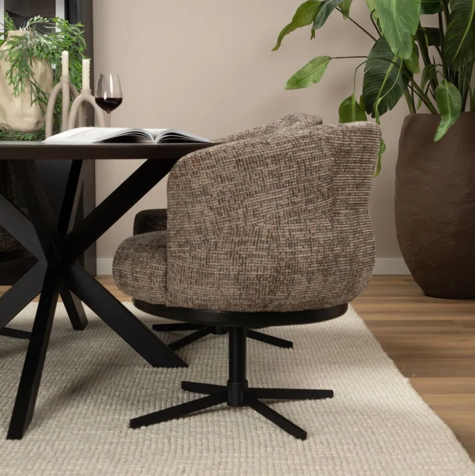 Eetkamerstoel Aswin combineert design en functionaliteit. Het metalen onderstel zorgt voor een stevige basis en maakt het mogelijk om 360 graden te draaien. De zitting met pocketvering biedt extra comfort, zodat je langdurig comfortabel kunt zitten. Stel de stoel eenvoudig samen in jouw gewenste kleur, zodat deze perfect past in jouw interieur.