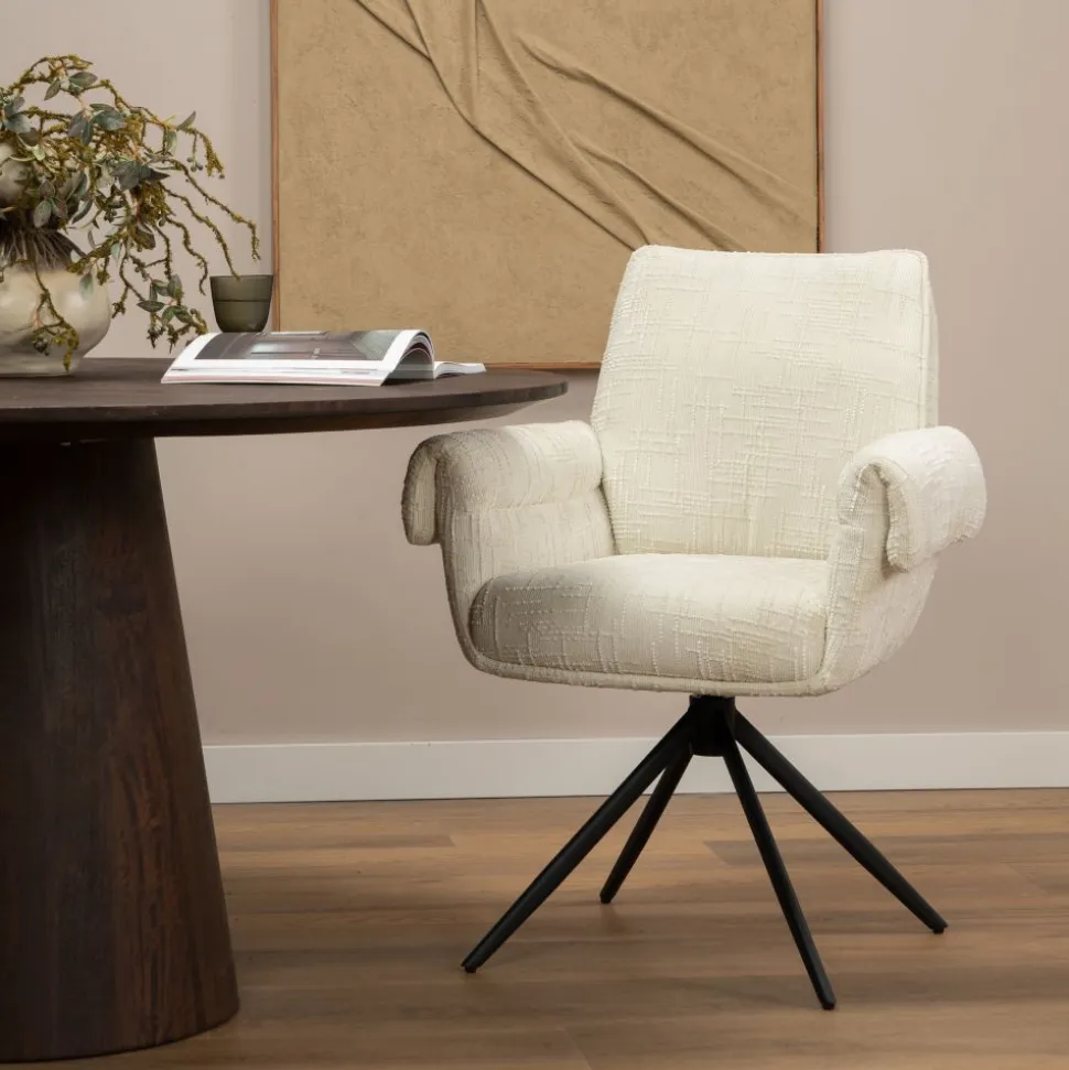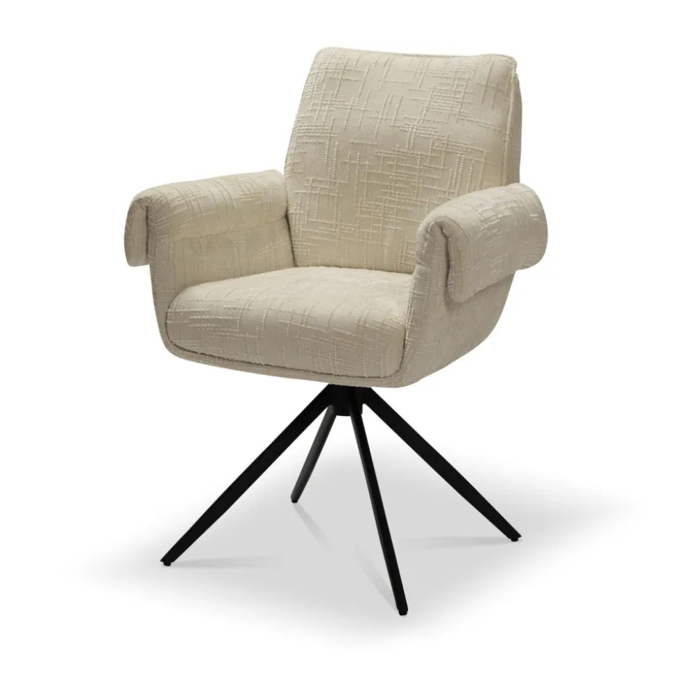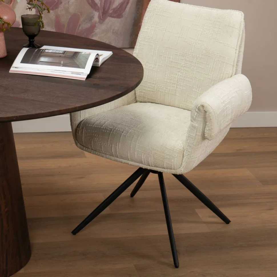 Eetkamerstoel Caro is een comfortabele stoel met een stijlvolle en luxe uitstraling. De stoel is bekleed met een luxe die zorgt voor een warme look en prettig zitcomfort aan de eettafel. De armleuningen geven de stoel een herkenbare en eigen uitstraling en bieden extra comfort tijdens het zitten. Het zwarte onderstel kan 360 graden draaien, waardoor je makkelijk aanschuift en opstaat zonder de stoel te hoeven verplaatsen.