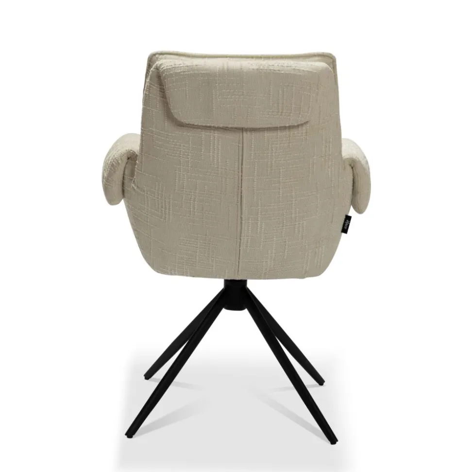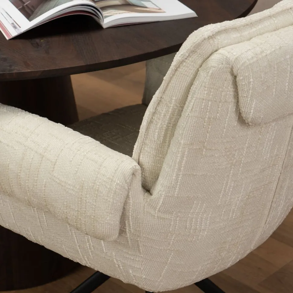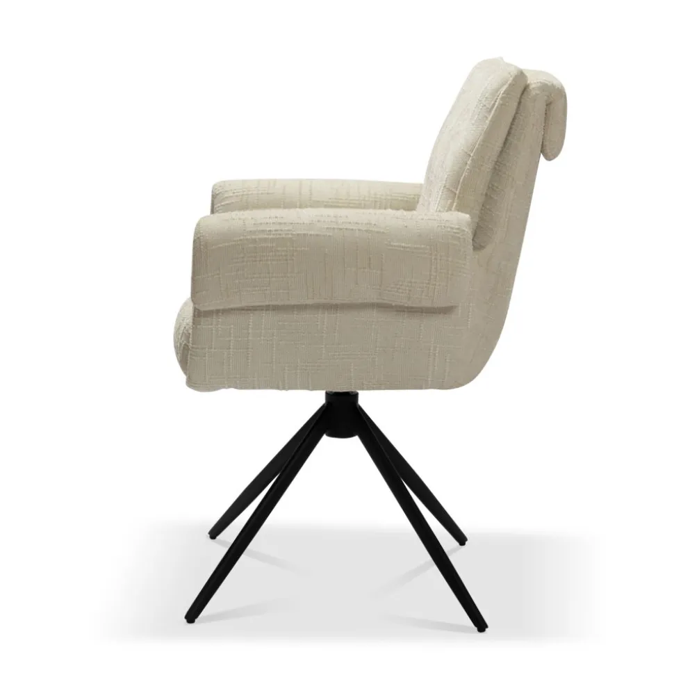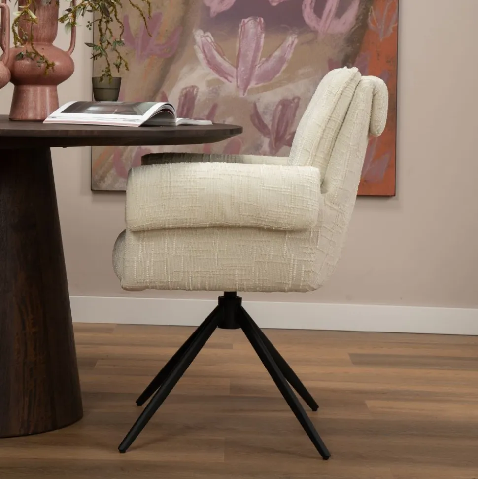 Eetkamerstoel Caro is een comfortabele stoel met een stijlvolle en luxe uitstraling. De stoel is bekleed met een luxe die zorgt voor een warme look en prettig zitcomfort aan de eettafel. De armleuningen geven de stoel een herkenbare en eigen uitstraling en bieden extra comfort tijdens het zitten. Het zwarte onderstel kan 360 graden draaien, waardoor je makkelijk aanschuift en opstaat zonder de stoel te hoeven verplaatsen.