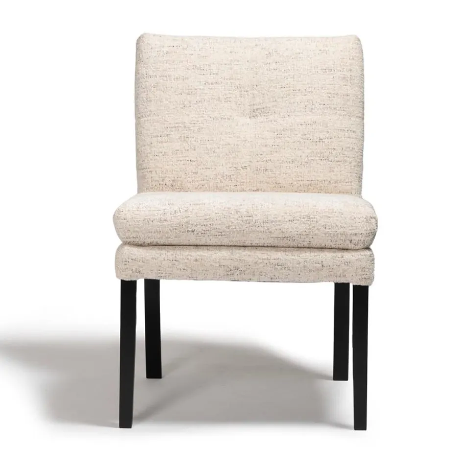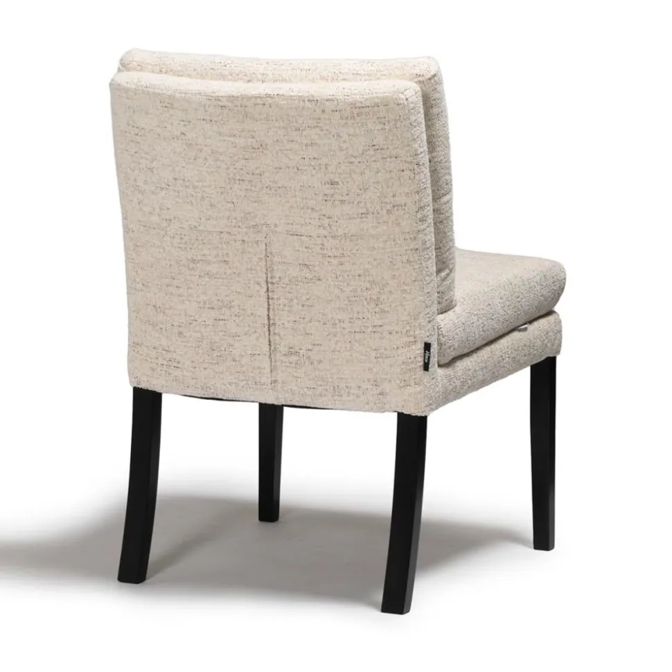 Deze hedendaagse stoel, genaamd Carthage, combineert moderne stijl met prachtige stiksels. Hij is bekleed met een zachte stof en elegante houten poten.