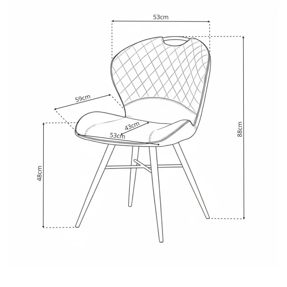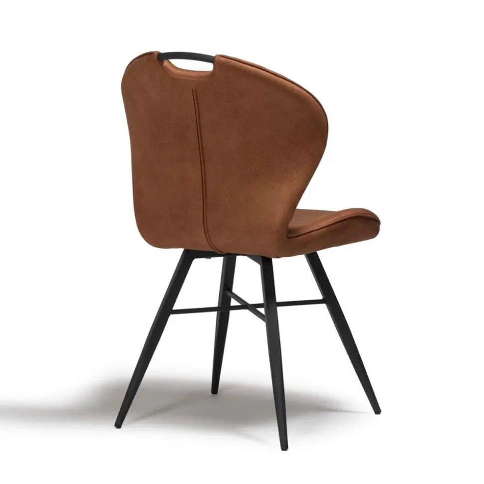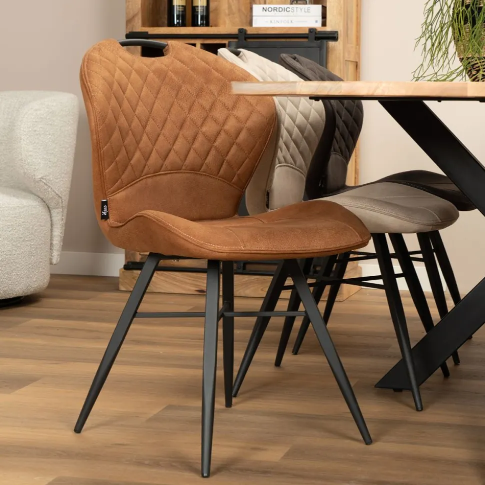 Eetkamerstoel Grace is een klassieke stoel met fraai carré stiksel in de rugleuning. De stoel is uitgevoerd in een zachte stof met daarin een patroon dat lijkt op suède. Deze luxe eetkamerstoel is voorzien van een handvat in de rugleuning en heeft zwart metalen poten.