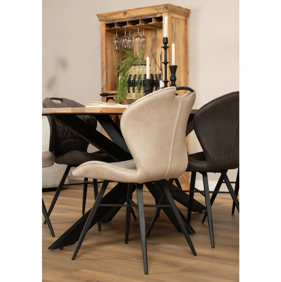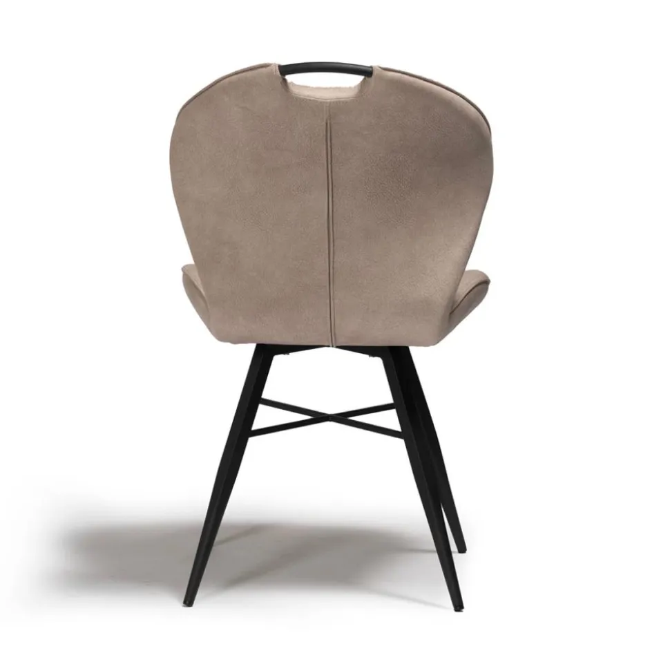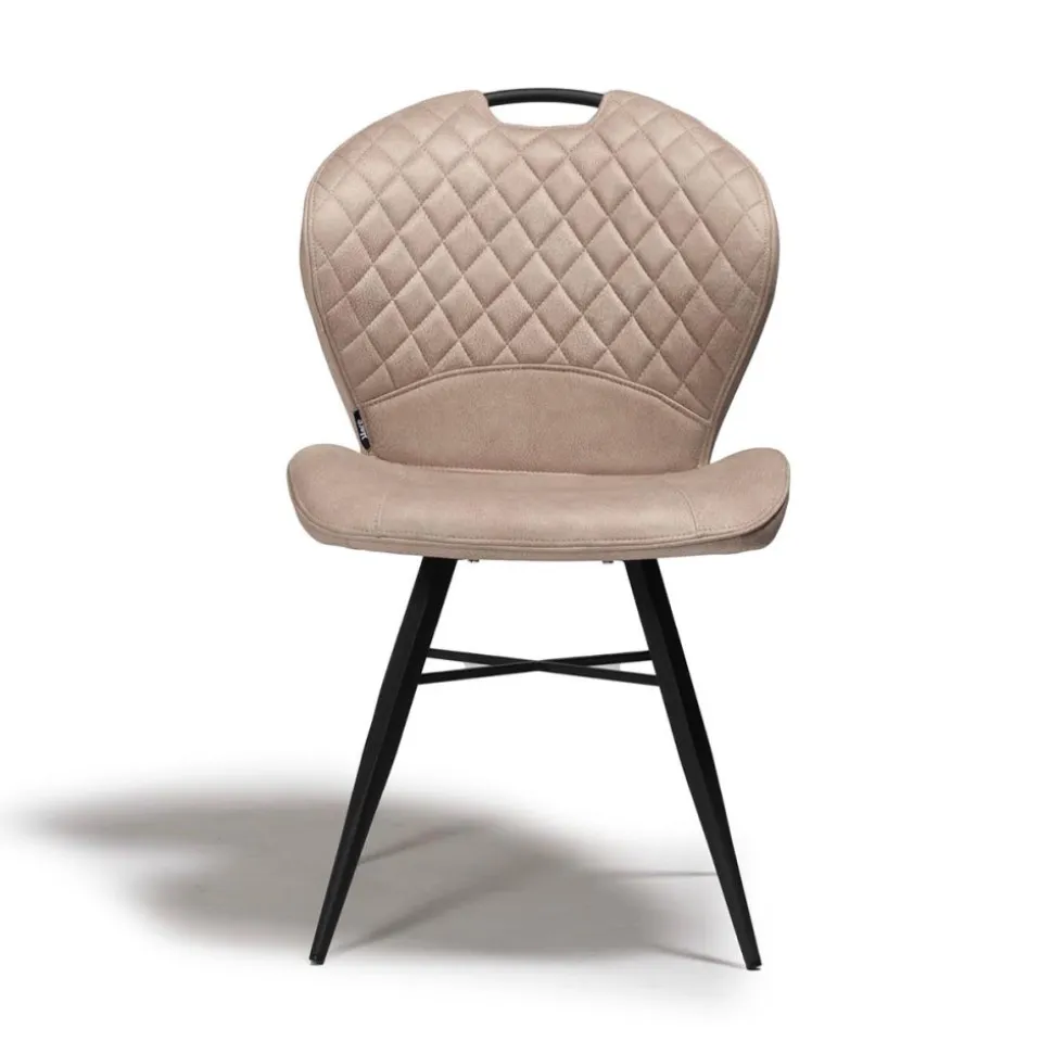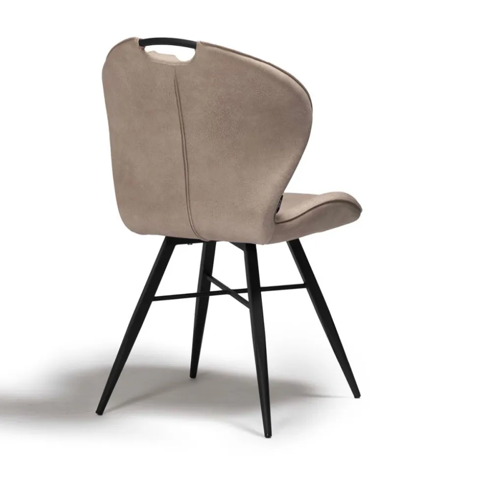 Eetkamerstoel Grace is een klassieke stoel met fraai carré stiksel in de rugleuning. De stoel is uitgevoerd in een zachte stof met daarin een patroon dat lijkt op suède. Deze luxe eetkamerstoel is voorzien van een handvat in de rugleuning en heeft zwart metalen poten.