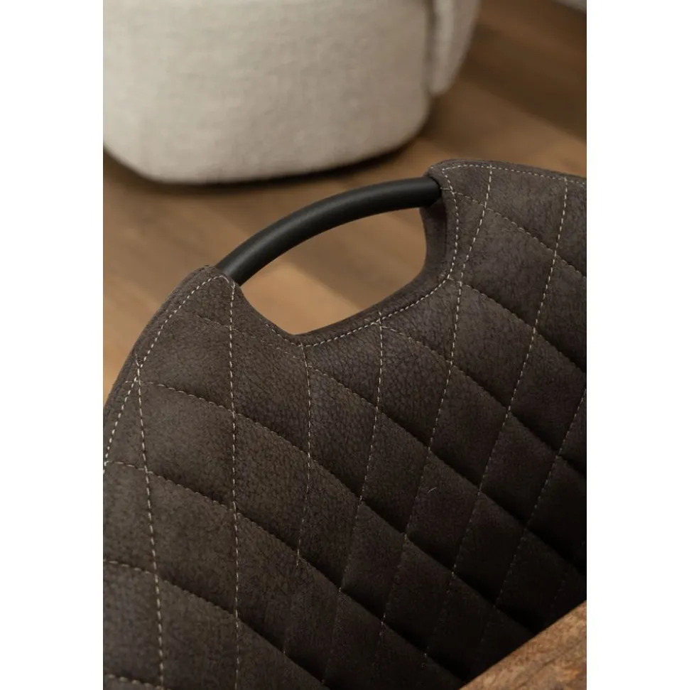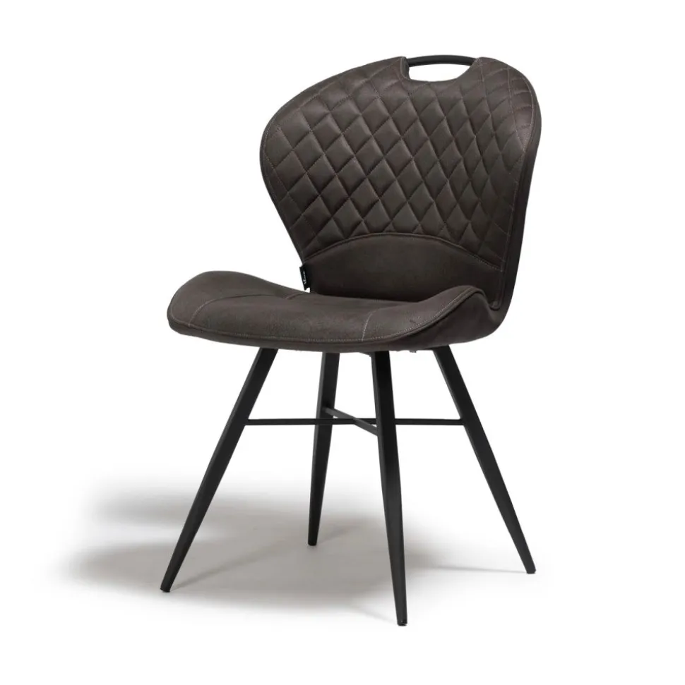 Eetkamerstoel Grace is een klassieke stoel met fraai carré stiksel in de rugleuning. De stoel is uitgevoerd in een zachte stof met daarin een patroon dat lijkt op suède. Deze luxe eetkamerstoel is voorzien van een handvat in de rugleuning en heeft zwart metalen poten.