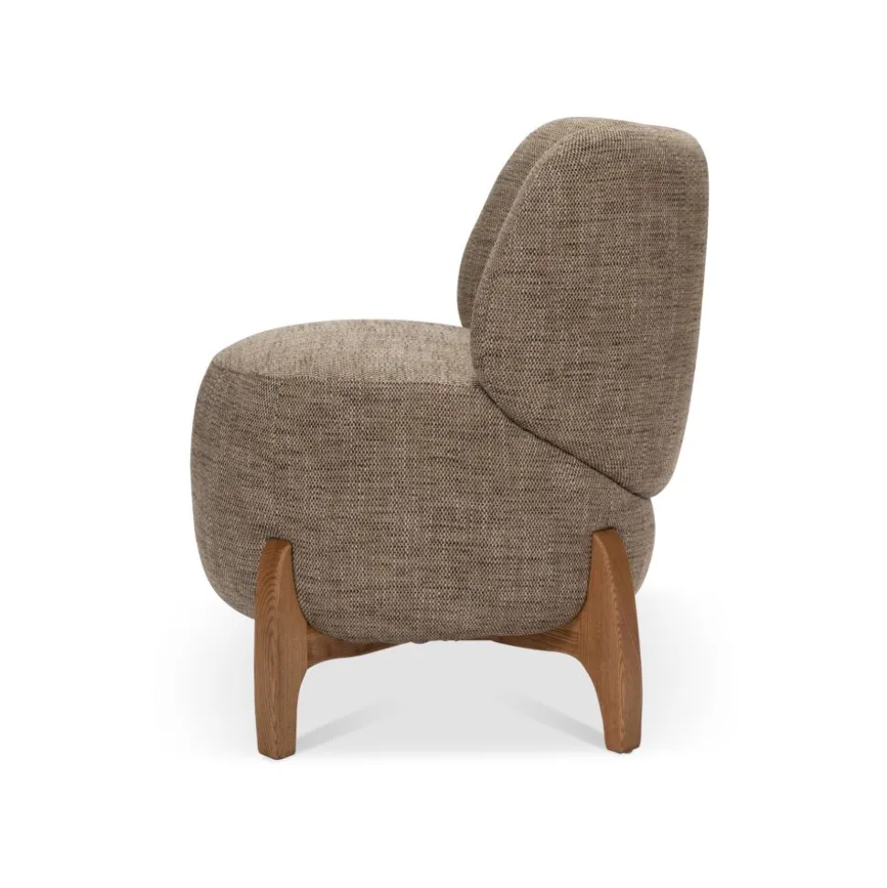 Eetkamerstoel Joy heeft een warme en natuurlijke uitstraling met een speels, rond design. De zachte vormen en de combinatie van stof en hout zorgen voor een rustige en uitnodigende look die perfect past in een modern of Scandinavisch interieur.
