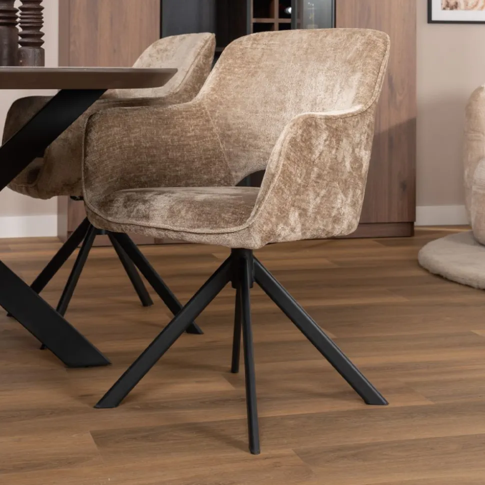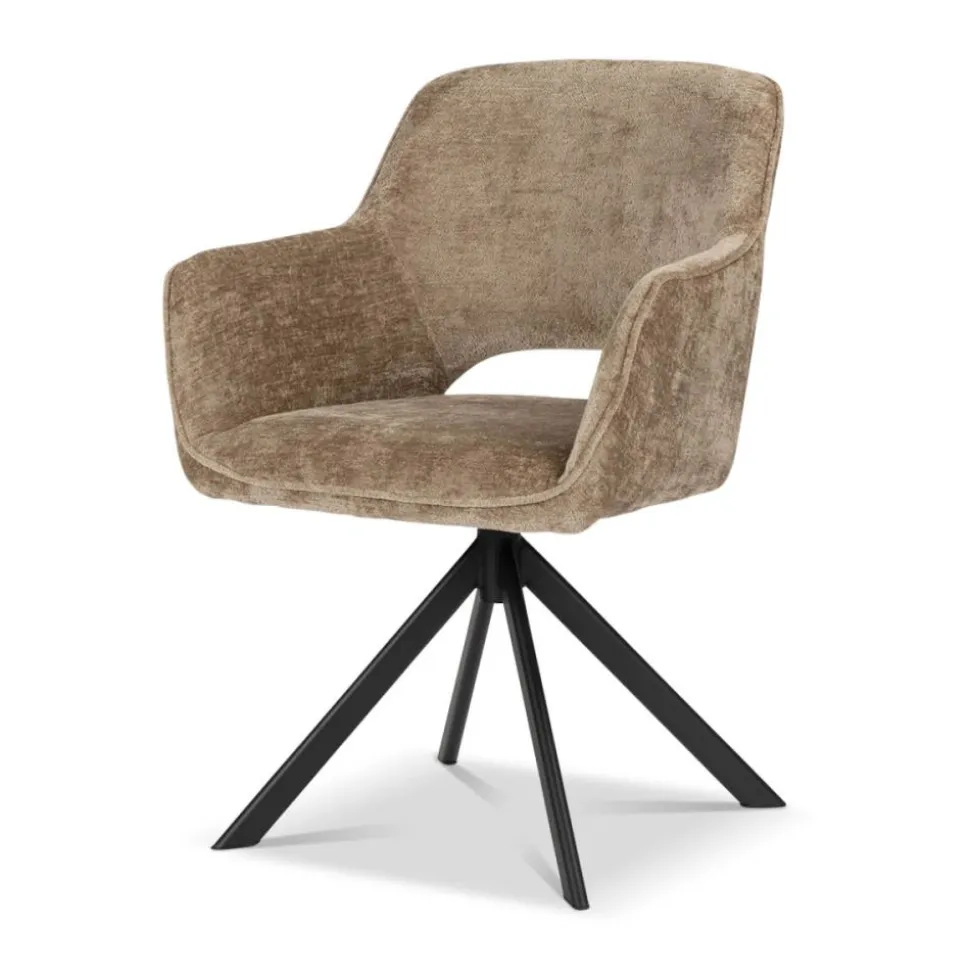 Onze eetkamerstoel Lynda is uitgevoerd in een fijne stof. De stoel heeft een gave opening in de rugleuning, wat zorgt voor een ruimtelijk effect. De stoel staat op een stoere, metalen kruispoot die zwart van kleur is. Stoel Lynda is verkrijgbaar in 3 kleuren: bruin, crème en taupe.