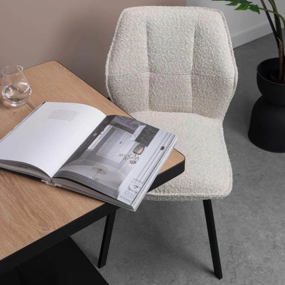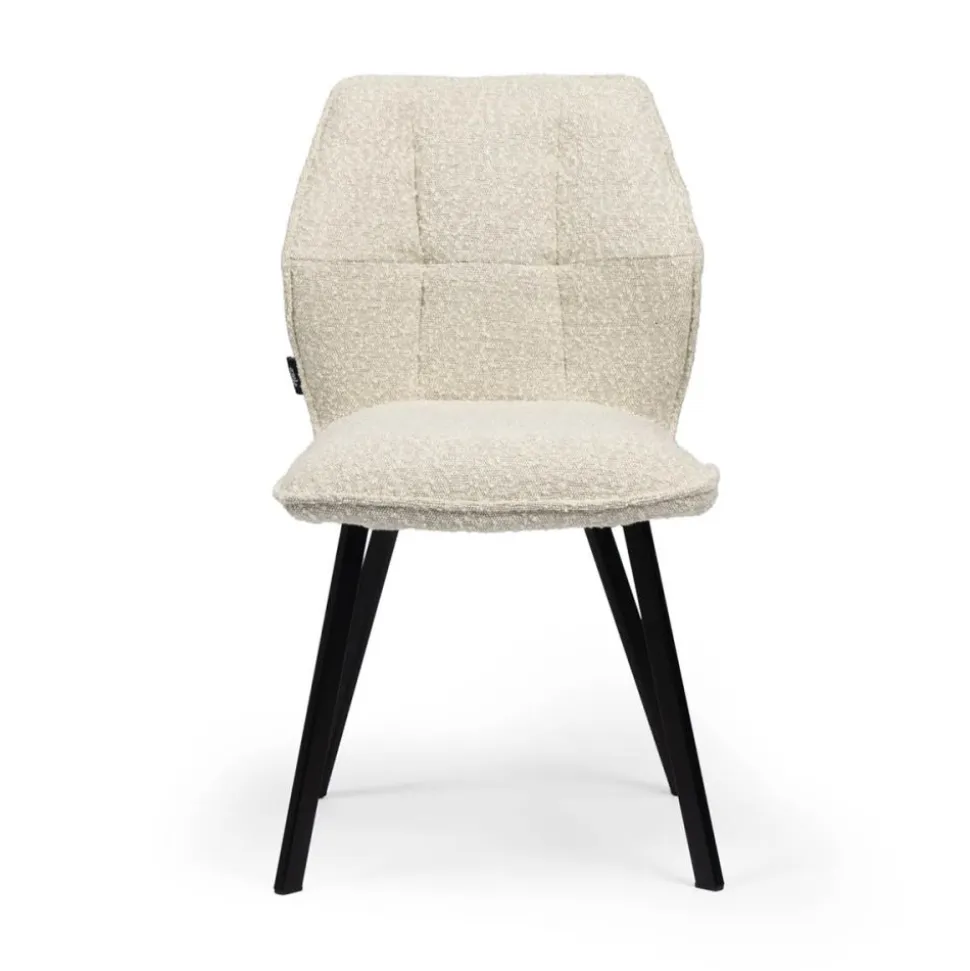 Onze eetkamerstoel Micha is uitgevoerd in een trendy, bouclé stof. De stoel heeft een stiksel in de zit- en rugleuning en een metalen onderstel dat zwart van kleur is. Eetkamerstoel Micha is verkrijgbaar in de kleur: crème. Deze hippe stoel is de betaalbare oplossing voor jouw moderne woonkamer, waardoor je kennis maakt met dat lekkere thuisgevoel.