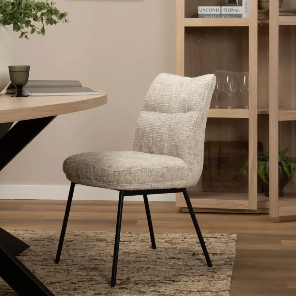 De eetkamerstoel Rico is uitgevoerd in een zachte stof en voorzien van een comfortabele rug- en zitting. Het zwarte metalen onderstel geeft de stoel een moderne uitstraling. Stoel Rico is verkrijgbaar in meerdere kleuren.