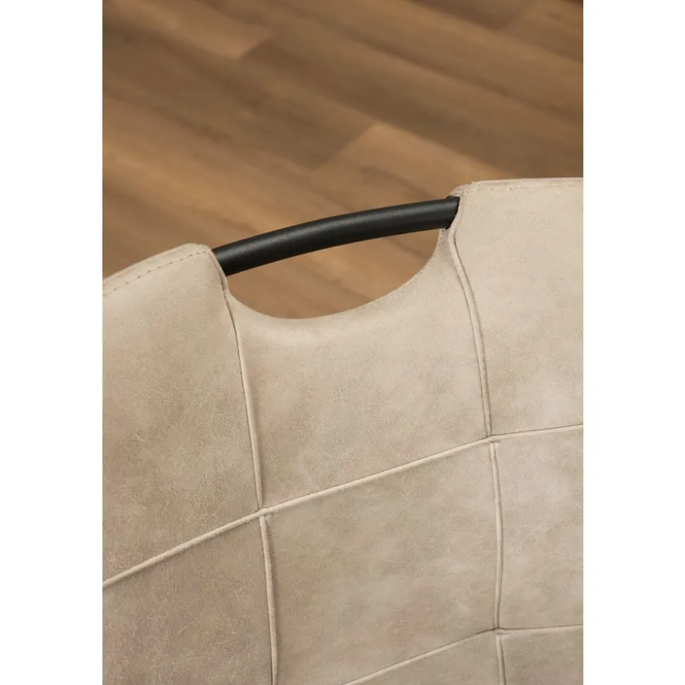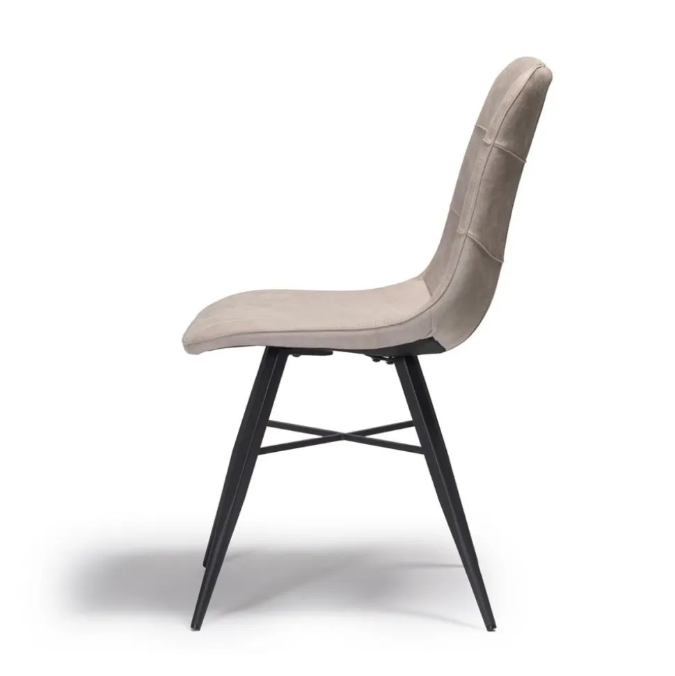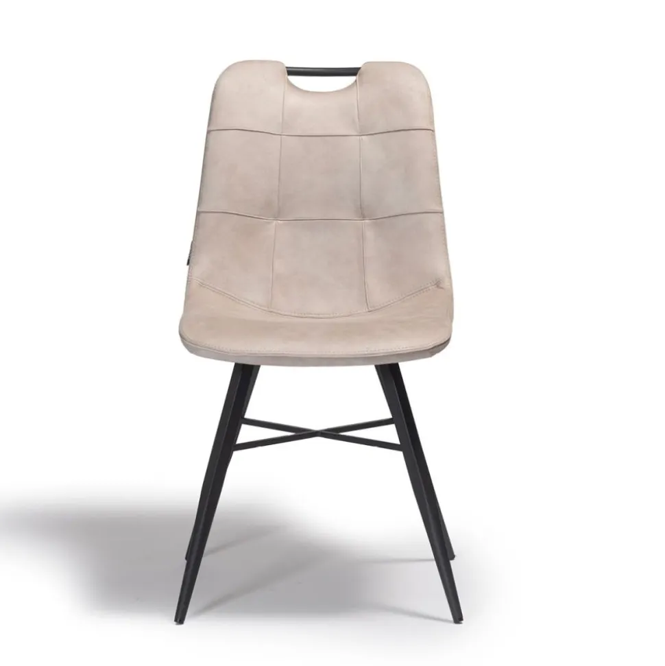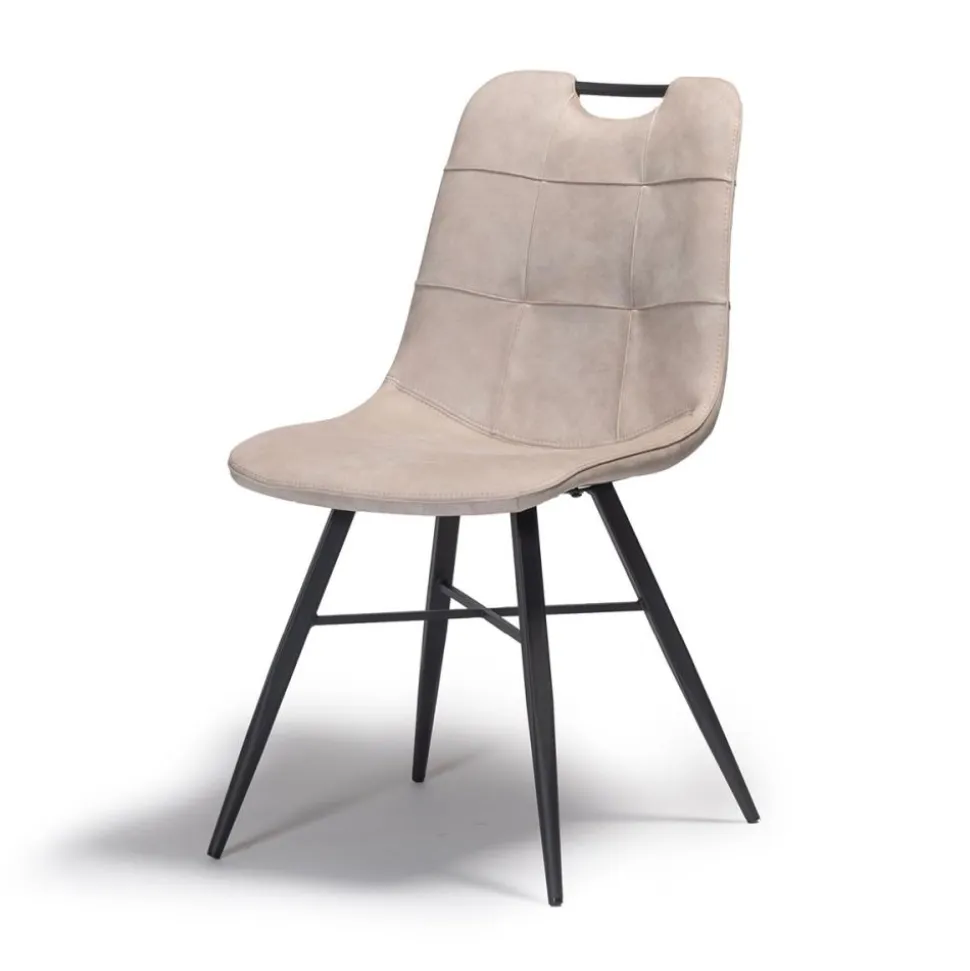 Eetkamerstoel Roady is een moderne stoel met fraai stiksel en een handvat in de rugleuning. De stoel is uitgevoerd in een zachte stof met daarin een patroon dat lijkt op suède. Deze luxe eetkamerstoel is voorzien van zwart metalen poten.