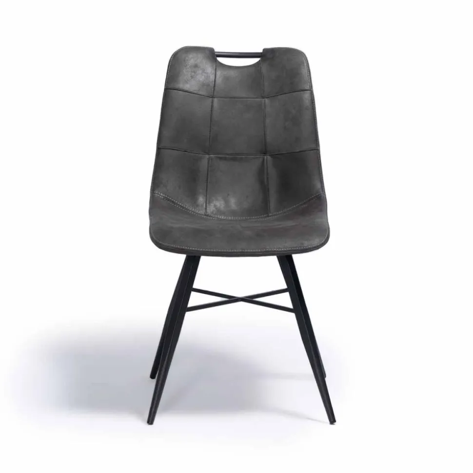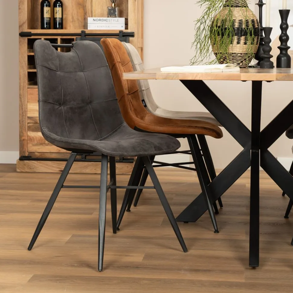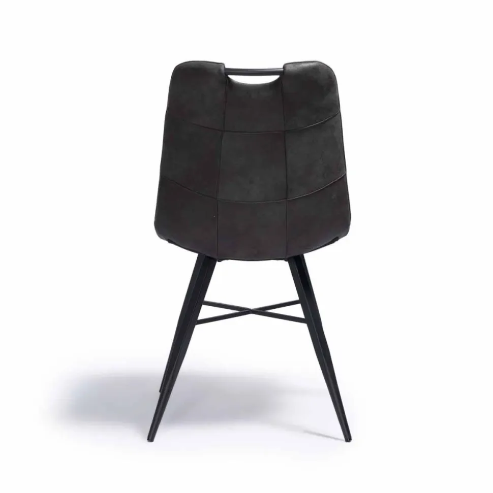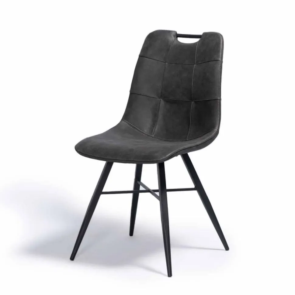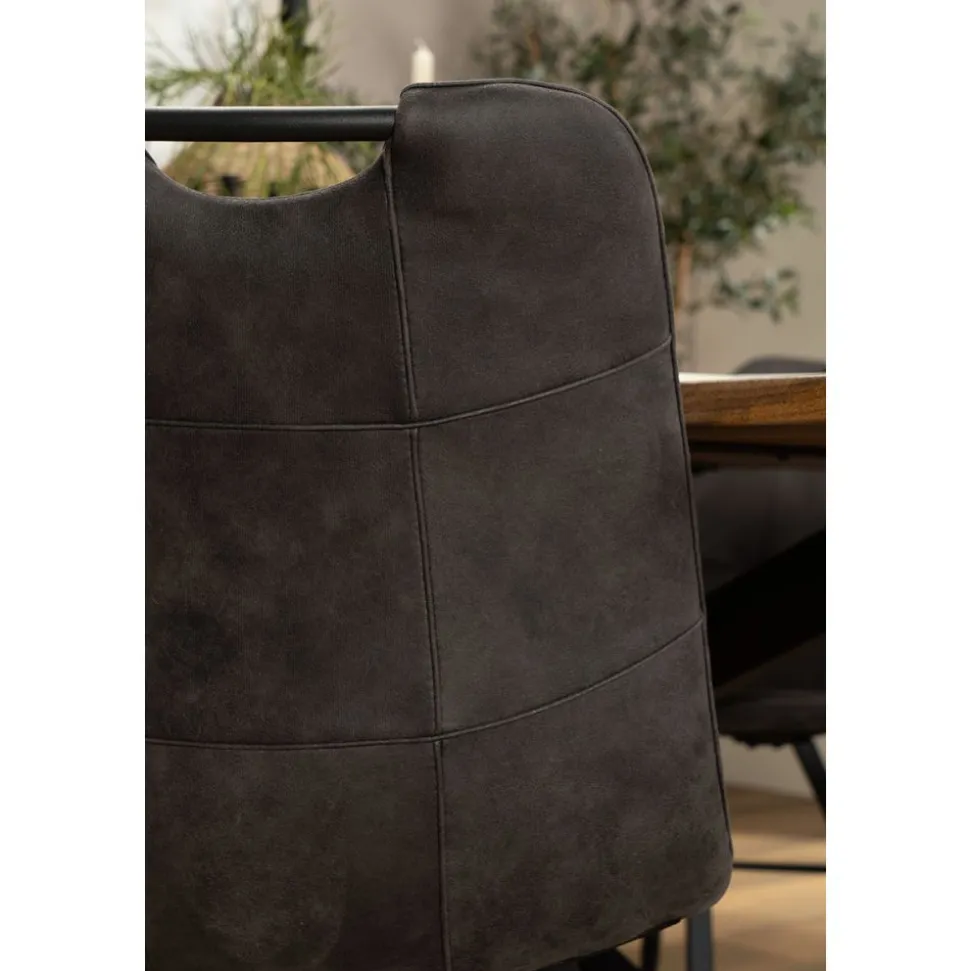 Eetkamerstoel Roady is een moderne stoel met fraai stiksel en een handvat in de rugleuning. De stoel is uitgevoerd in een zachte stof met daarin een patroon dat lijkt op suède. Deze luxe eetkamerstoel is voorzien van zwart metalen poten.