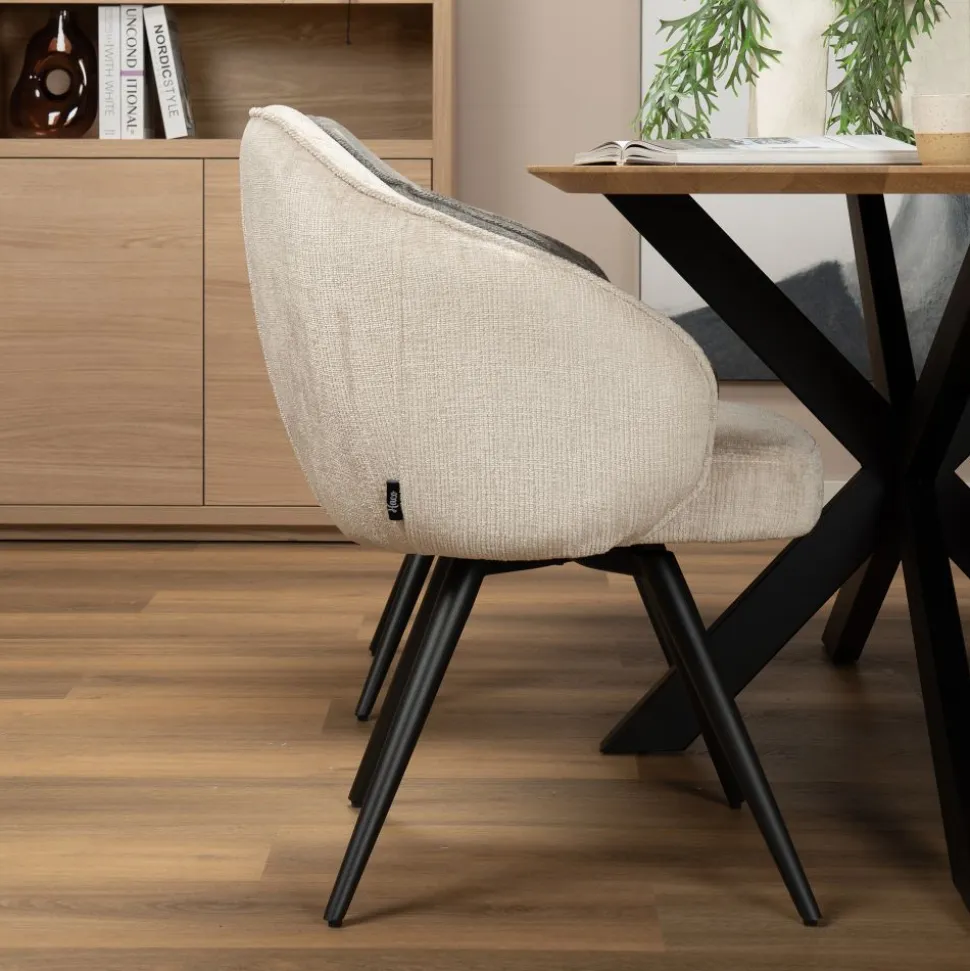 Dankzij de comfortabele zitting en de stevige rugleuning biedt de stoel uitstekende ondersteuning, tijdens lange diners of gezellige avonden. De stoel is 180 graden draaibaar, wat zorgt voor extra gemak en comfort.