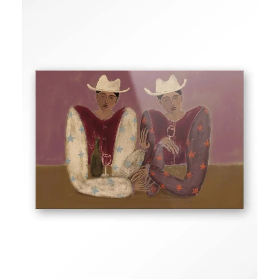 Een modern schilderij met twee karaktervolle figuren en speelse sterpatronen. De warme kleuren en artistieke stijl geven het kunstwerk een unieke en levendige uitstraling. Perfect als opvallende eyecatcher in een eigentijds interieur. Uitgevoerd als glazen schilderij, wat zorgt voor een strakke uitstraling.