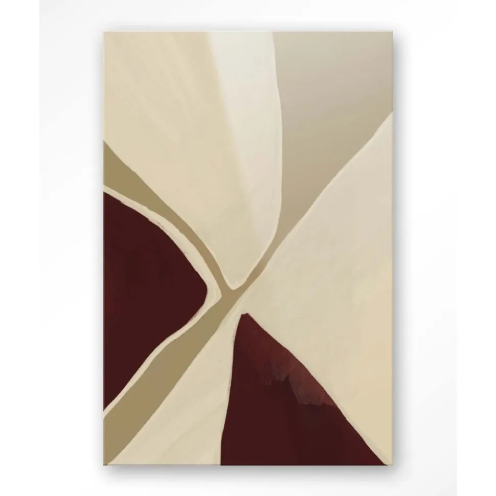 Vloeiende abstracte vormen in een neutraal kleurenpalet van beige en bordeaux creëren een verfijnde compositie. Dit schilderij straalt elegantie en eenvoud uit en past perfect bij een modern interieur. Uitgevoerd als glazen schilderij, wat zorgt voor een strakke uitstraling.