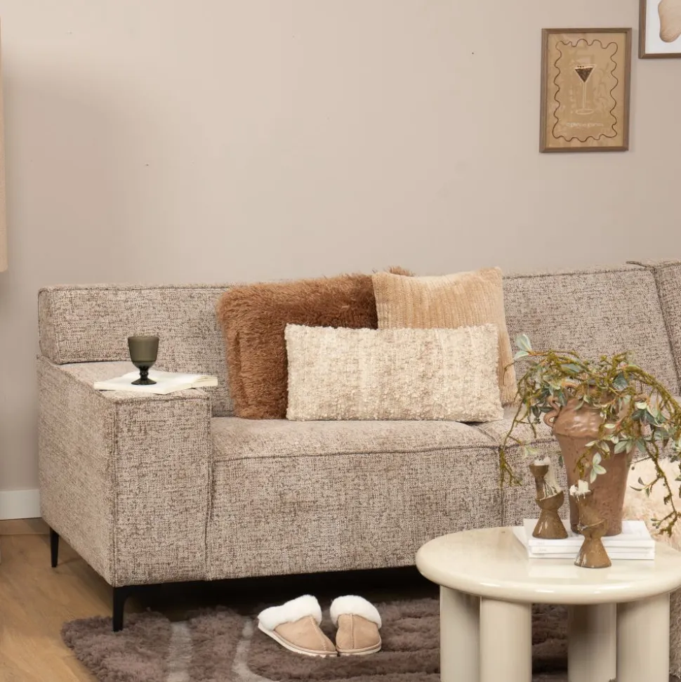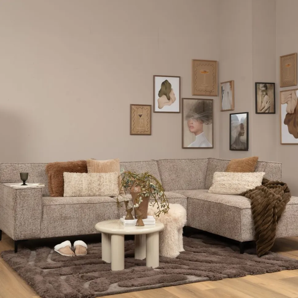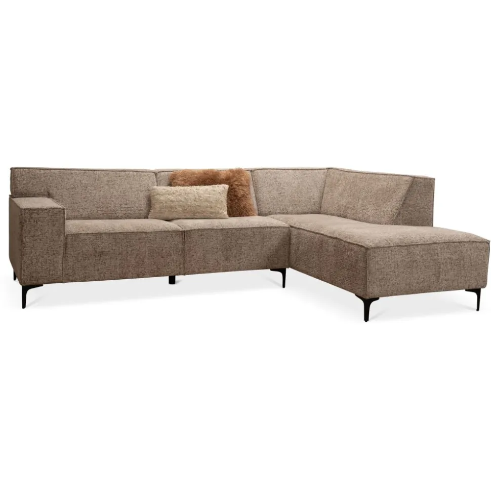Puck is een prachtige, moderne hoekbank met een lekkere diepe zitting. De bank is uitgevoerd in de populaire stof Retro Bliss. De bank is voorzien een brede armleuning en staat op metalen pootjes die zwart van kleur zijn.