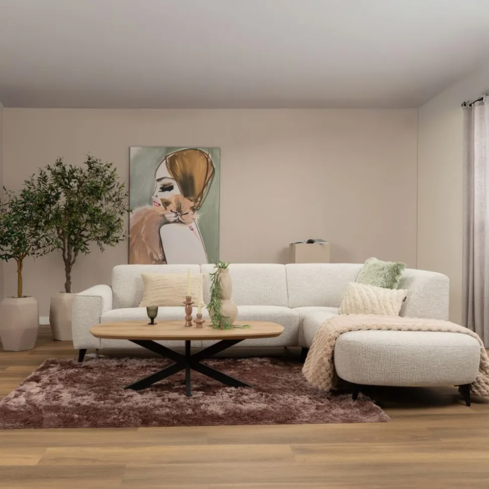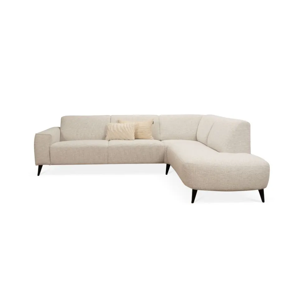 Geef jouw woonkamer een stijlvolle upgrade met hoekbank Yentel. Deze moderne bank is uitgevoerd in een prachtige beige stof en afgewerkt met een royale, ronde ottomaan . Een echte eyecatcher in ieder interieur. De strakke, metalen poten zorgen voor een luxe en eigentijdse uitstraling.