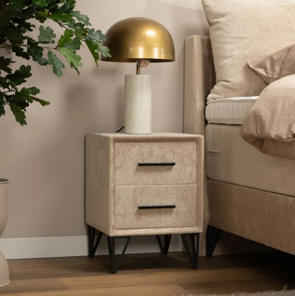 Dit gave nachtkastje met 2 lades is prachtig afgewerkt en lekker praktisch naast je nieuwe boxspring. Het nachtkastje heeft een smalle handgrepen en staat op een stijlvol metalen onderstel. Configureer eenvoudig je nachtkastje in dezelfde stof als je nieuwe boxspring.