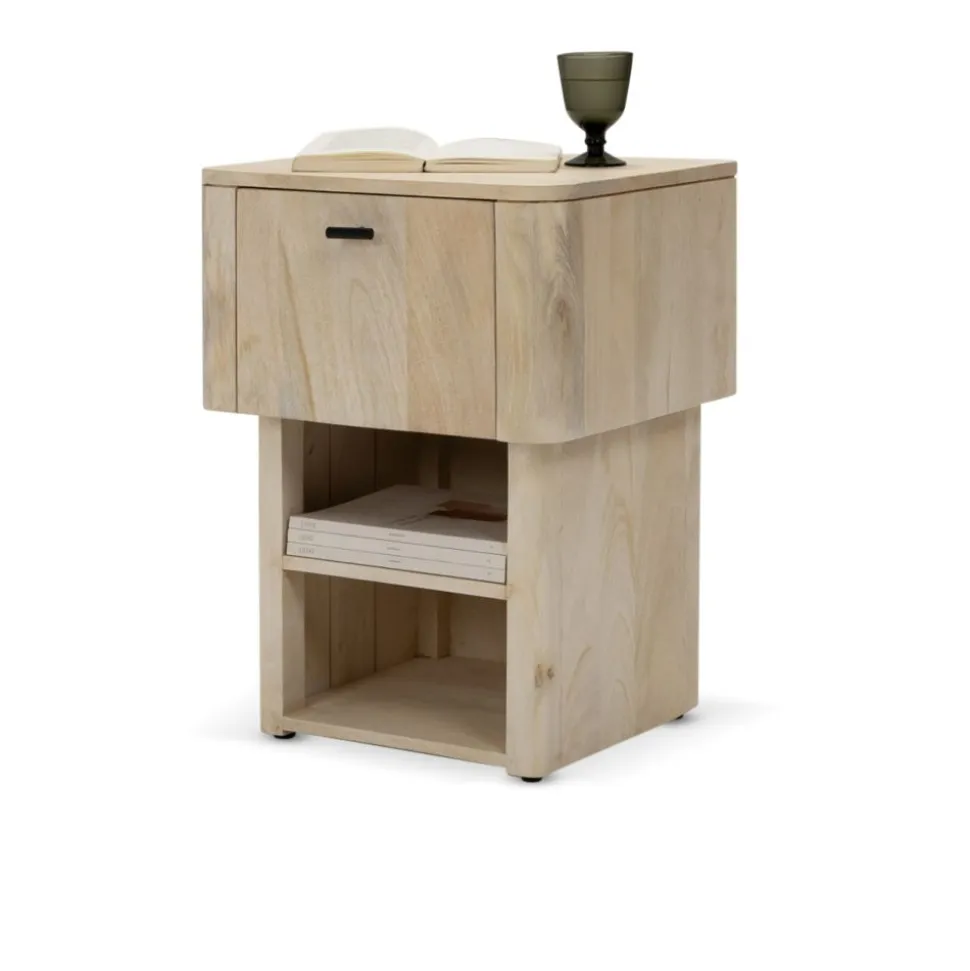 Het Sofia nachtkastje in naturel houtkleur combineert een strakke vormgeving met warme, natuurlijke tinten. Dankzij het minimalistische design en de mooie houtstructuur is dit nachtkastje een echte blikvanger in elke slaapkamer.