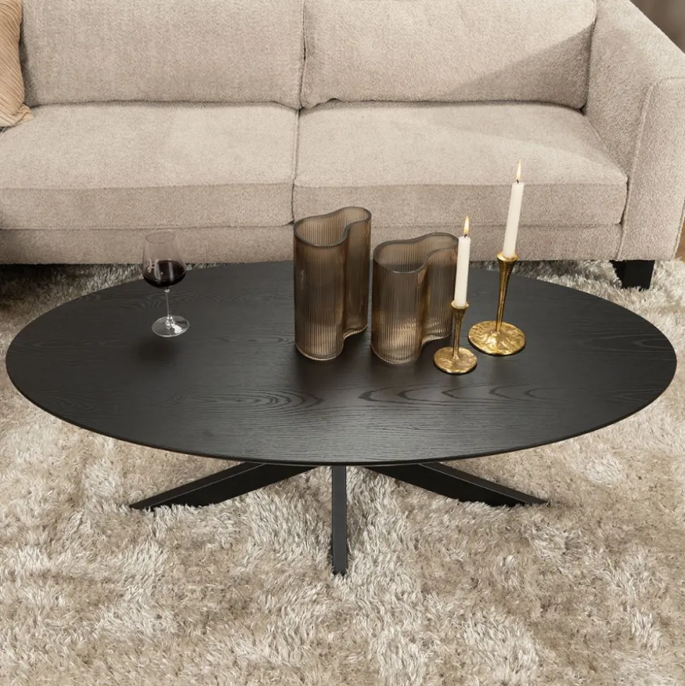 George is een trendy, ovale salontafel gemaakt van melamine. Het tafelblad is verjongd, heeft een gave, zwarte kleur en rust op een stoere, metalen spinpoot.