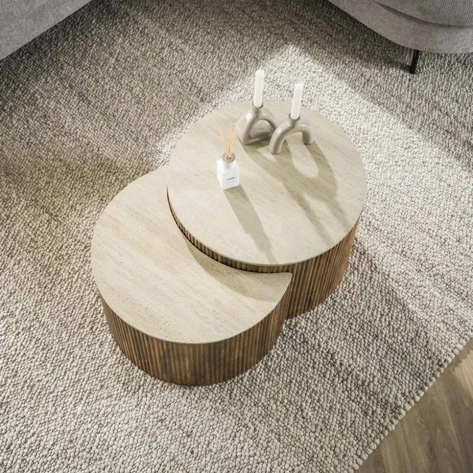 Salontafel set/2 halfrond Nuovo travertin / Massief mango zandkleur