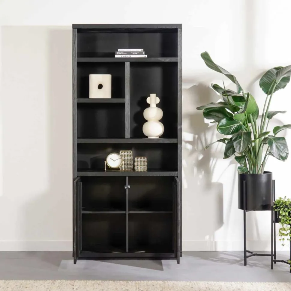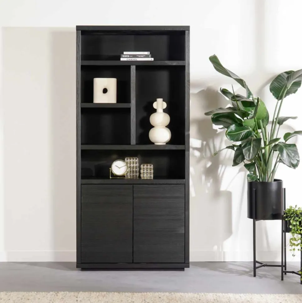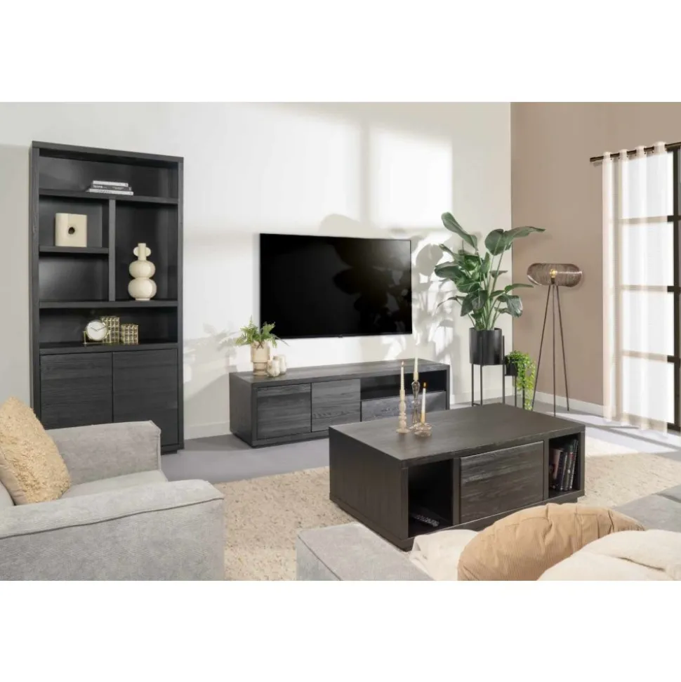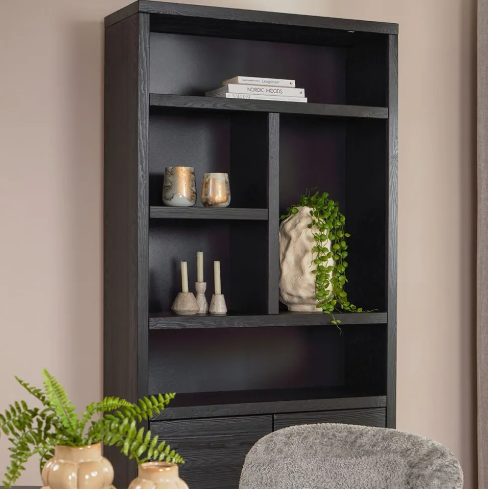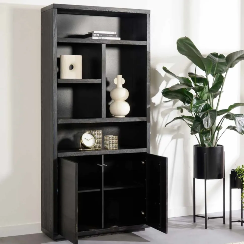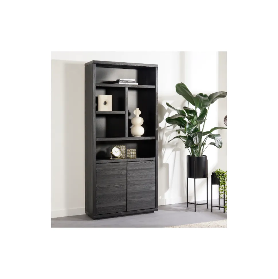 Maak kennis met onze stijlvolle woonserie Saalbach van topkwaliteit! Uniek in zijn soort en exclusief verkrijgbaar bij Haco wonen en slapen! Deze serie meubels hebben een luxe en tijdloze uitstraling. De kasten zijn gemaakt van grenen hout en uitgevoerd in een stoere zwarte kleur. De deurtjes zijn greeploos en makkelijk te openen door middel van het push-open systeem. Met de open vakken van de kasten heb je voldoende ruimte om leuk te decoreren voor bijvoorbeeld; fotolijstjes, boeken, souvenirs en natuurlijk de meest trendy accessoires. Mix and match de verschillende meubels en ga voor dat lekkere thuisgevoel !