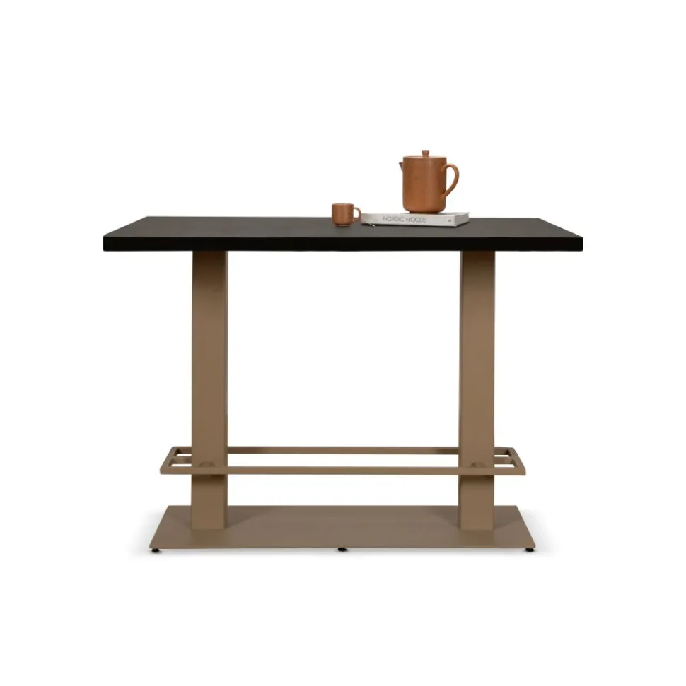 BartafelJason is een trendy, rechthoekige, bartafel gemaakt van melamine. Het tafelblad heeft een metalen rand en rust op een stoer, metalen onderstel met dwarspoot je comfortabel je voeten op kunt zetten. De bartafel is verkrijgbaar in 4 moderne kleuren.
