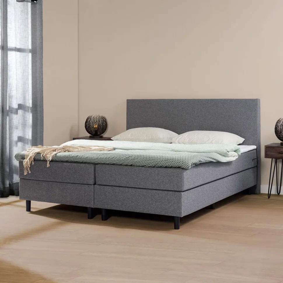 Lekker en betaalbaar slapen? Maak kennis met Budget! Deze mooie boxspring set bestaat uit een gestoffeerd hoofdbord, 2x 20 cm hoge onderboxen, 2x bonellvering matrassen en een bijpassend topmatras. De boxspring is als voorraadmodel uitgevoerd in de trendy stof Raquel en staat op kunststof poten.