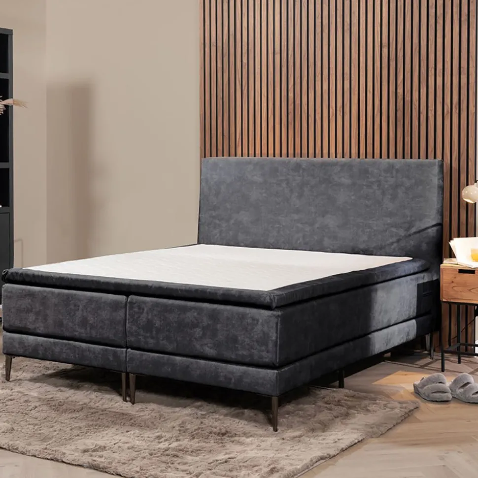Boxspring Epsilon is een prachtige en betaalbare boxspringset! De boxspringset bestaat uit een mooi afgewerkt hoofdbord, 2x smalle onderbox, 2x pocketveer matrassen, 1x 6 cm HR comfortschuim topmatras en een metalen potenset. De boxspring is uitgevoerd in de populaire velvet stof; Torre!