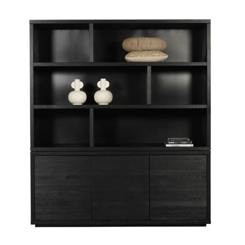 Maak kennis met onze stijlvolle woonserie Saalbach van topkwaliteit! Uniek in zijn soort en exclusief verkrijgbaar bij Haco wonen en slapen! Deze serie meubels hebben een luxe en tijdloze uitstraling. De kasten zijn gemaakt van grenen hout en uitgevoerd in een stoere zwarte kleur. De deuren zijn greeploos en makkelijk te openen door middel van het push-open systeem. Met de open vakken van de kasten heb je voldoende ruimte om leuk te decoreren voor bijvoorbeeld; fotolijstjes, boeken, souvenirs en natuurlijk de meest trendy accessoires. Mix and match de verschillende meubels en ga voor dat lekkere thuisgevoel !