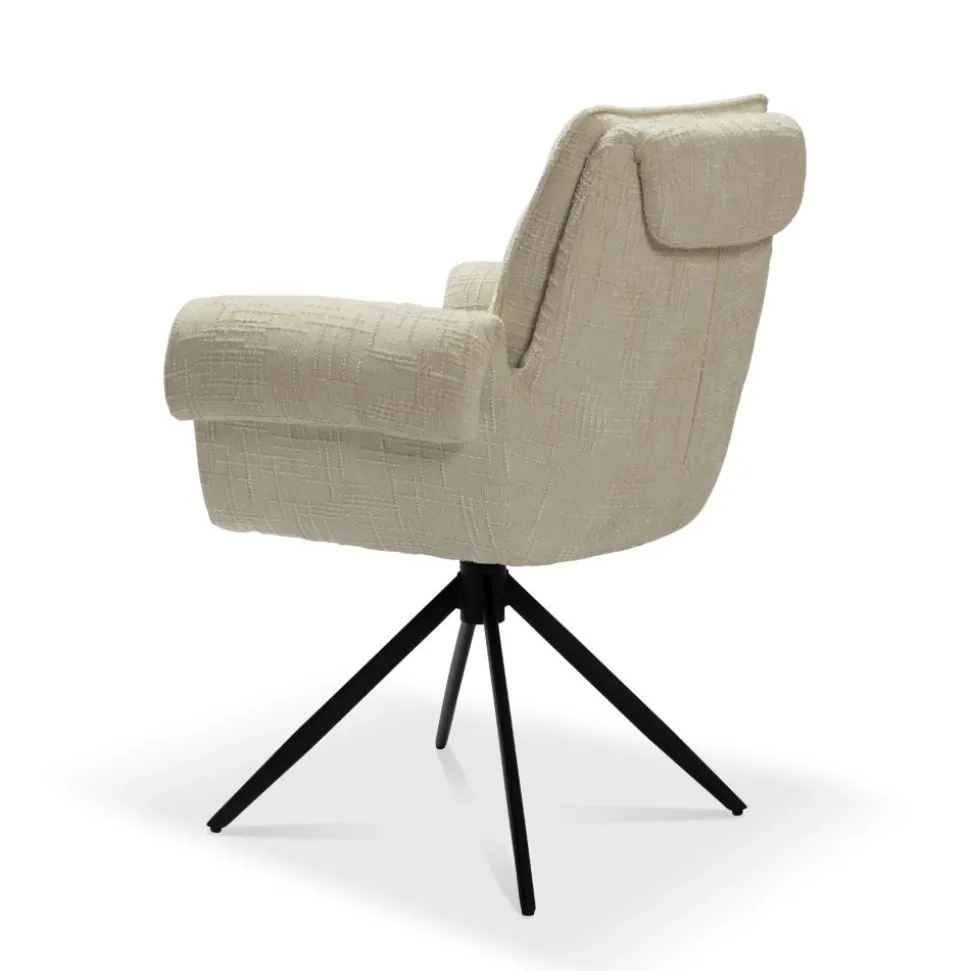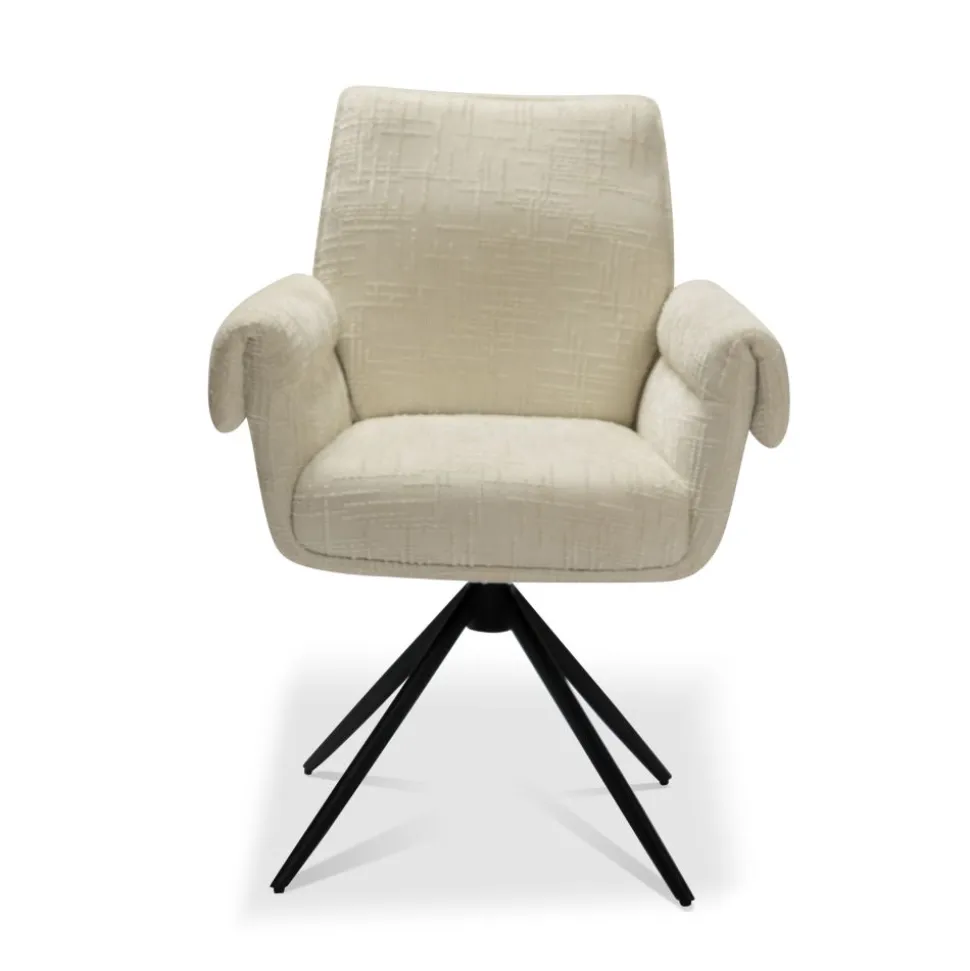 Eetkamerstoel Caro is een comfortabele stoel met een stijlvolle en luxe uitstraling. De stoel is bekleed met een luxe die zorgt voor een warme look en prettig zitcomfort aan de eettafel. De armleuningen geven de stoel een herkenbare en eigen uitstraling en bieden extra comfort tijdens het zitten. Het zwarte onderstel kan 360 graden draaien, waardoor je makkelijk aanschuift en opstaat zonder de stoel te hoeven verplaatsen.