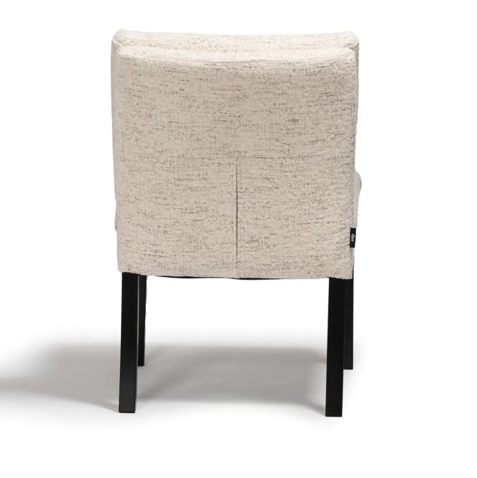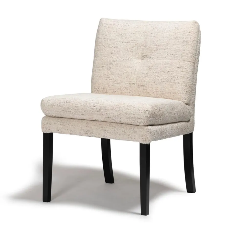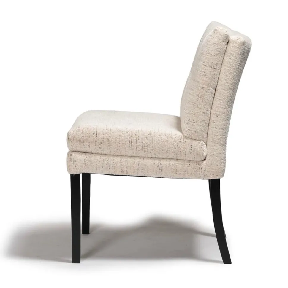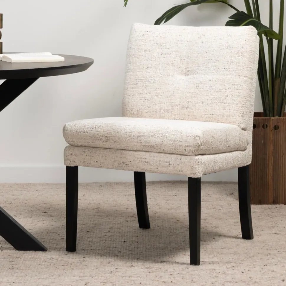 Deze hedendaagse stoel, genaamd Carthage, combineert moderne stijl met prachtige stiksels. Hij is bekleed met een zachte stof en elegante houten poten.