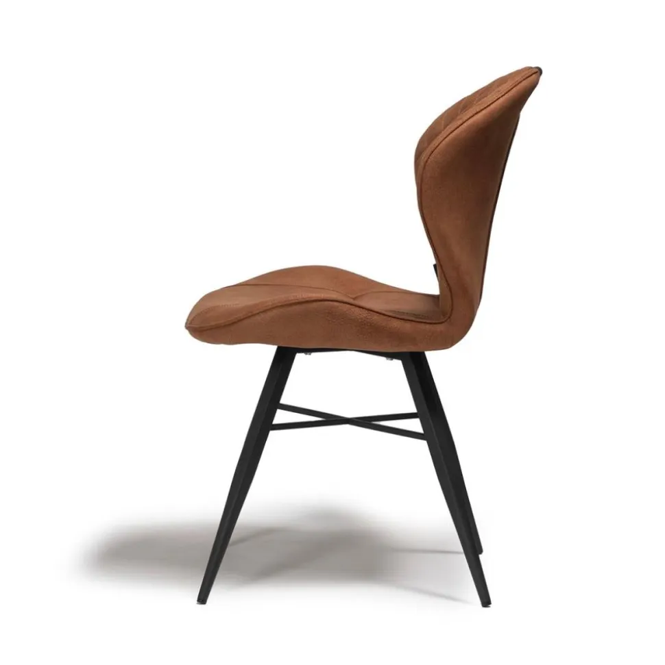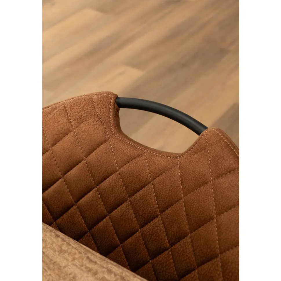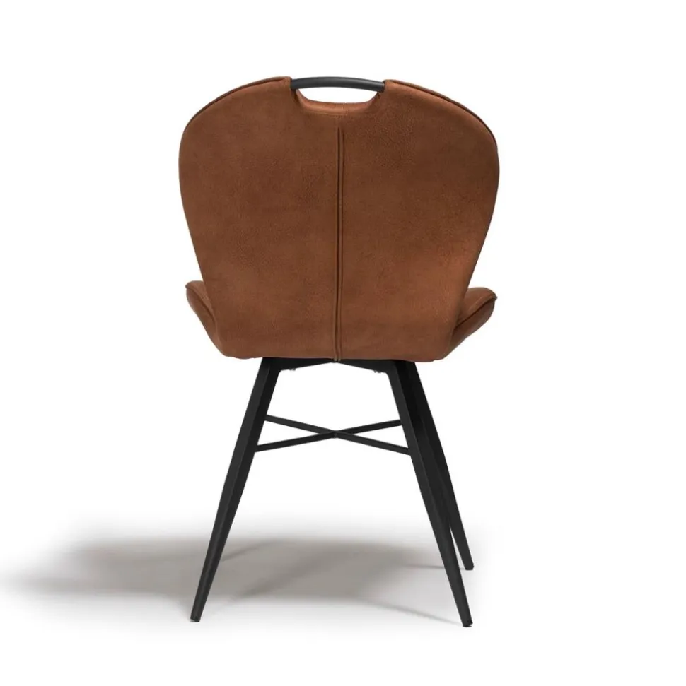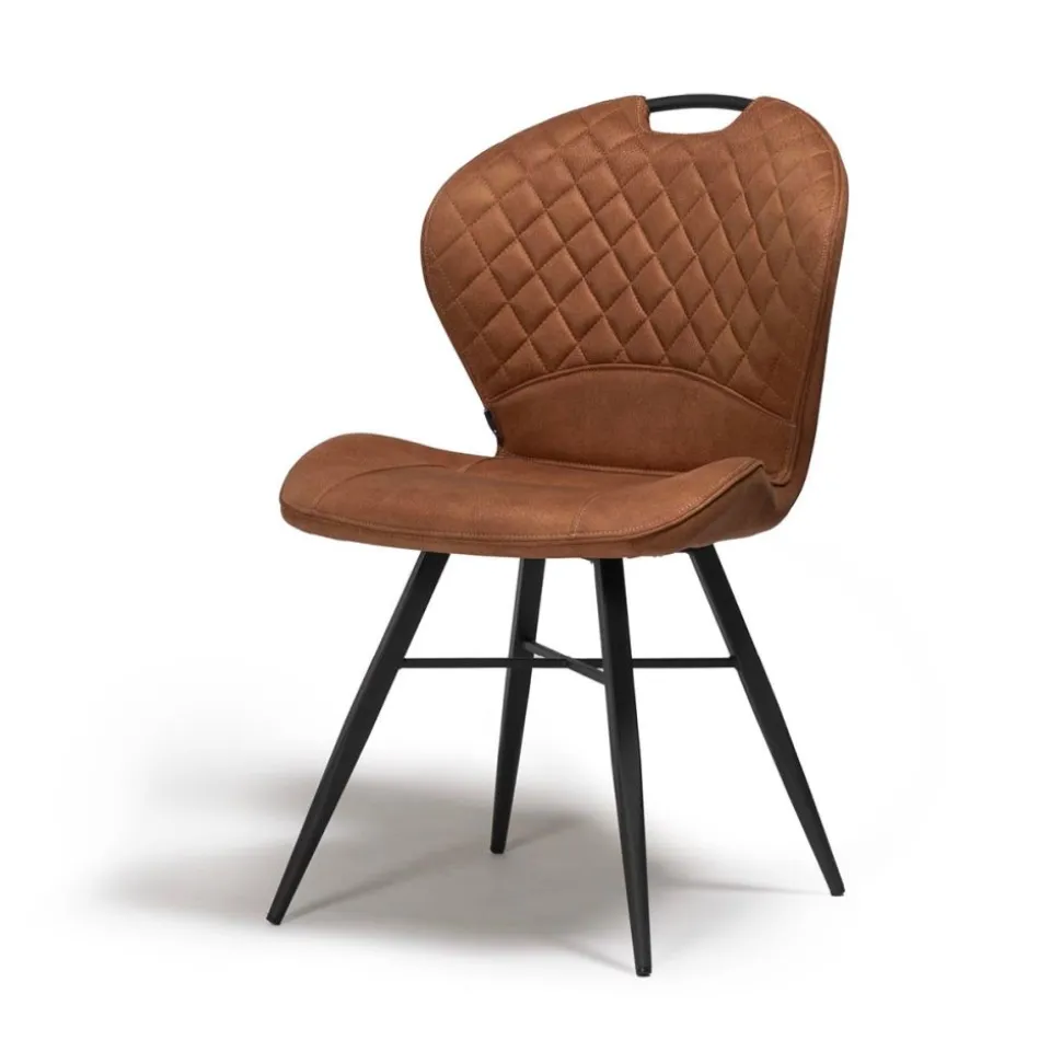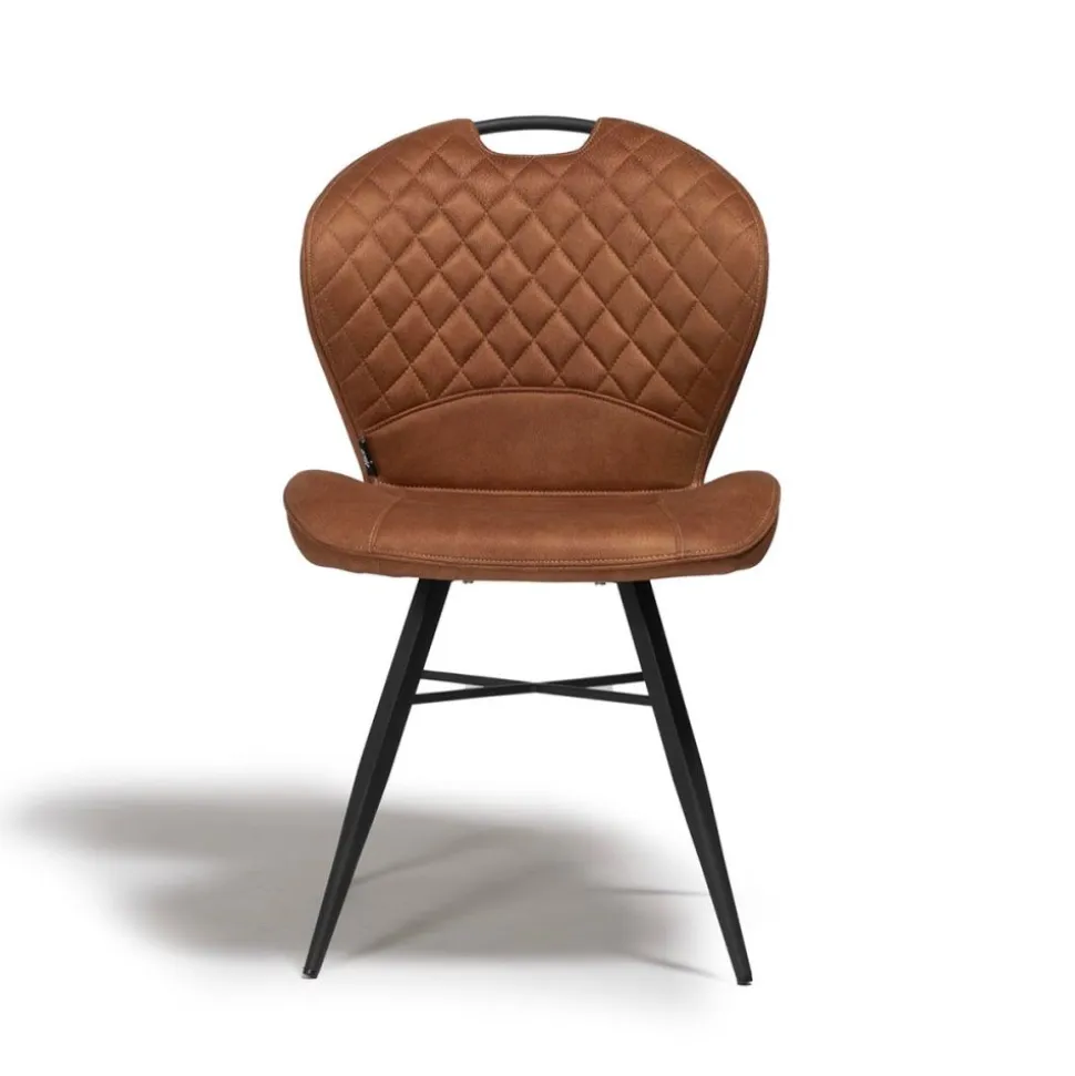 Eetkamerstoel Grace is een klassieke stoel met fraai carré stiksel in de rugleuning. De stoel is uitgevoerd in een zachte stof met daarin een patroon dat lijkt op suède. Deze luxe eetkamerstoel is voorzien van een handvat in de rugleuning en heeft zwart metalen poten.