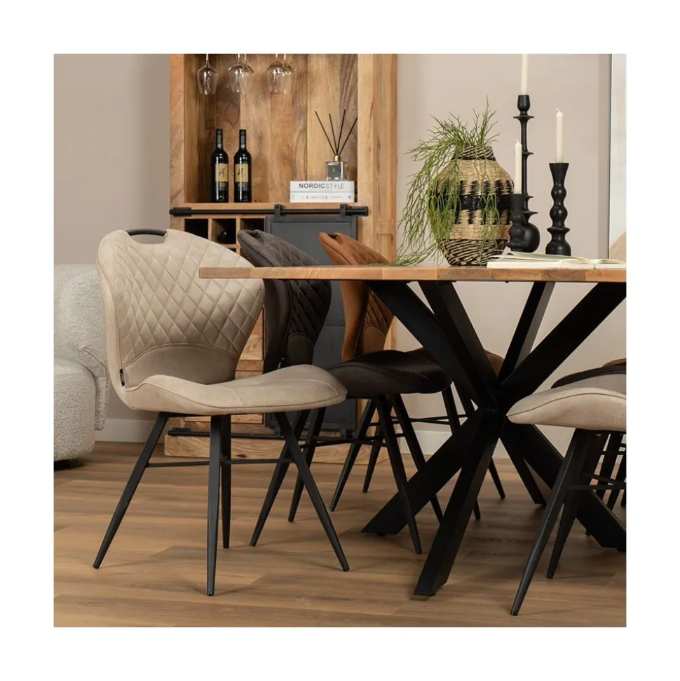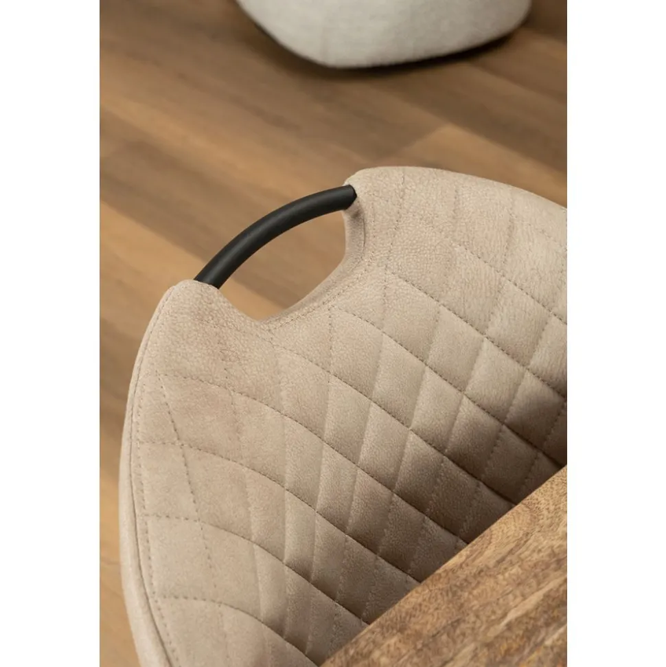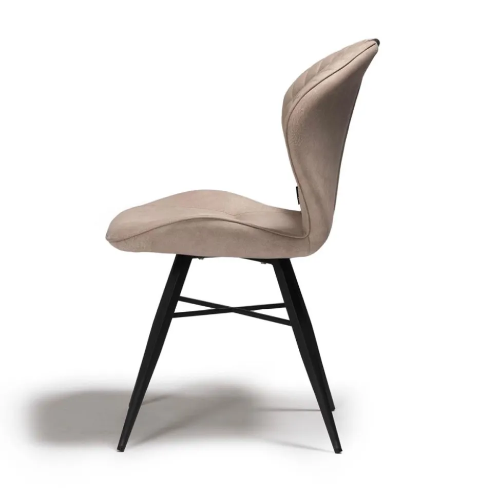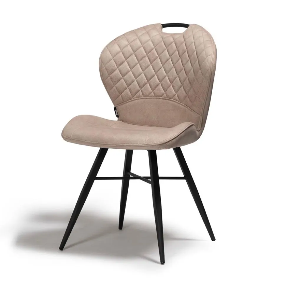 Eetkamerstoel Grace is een klassieke stoel met fraai carré stiksel in de rugleuning. De stoel is uitgevoerd in een zachte stof met daarin een patroon dat lijkt op suède. Deze luxe eetkamerstoel is voorzien van een handvat in de rugleuning en heeft zwart metalen poten.