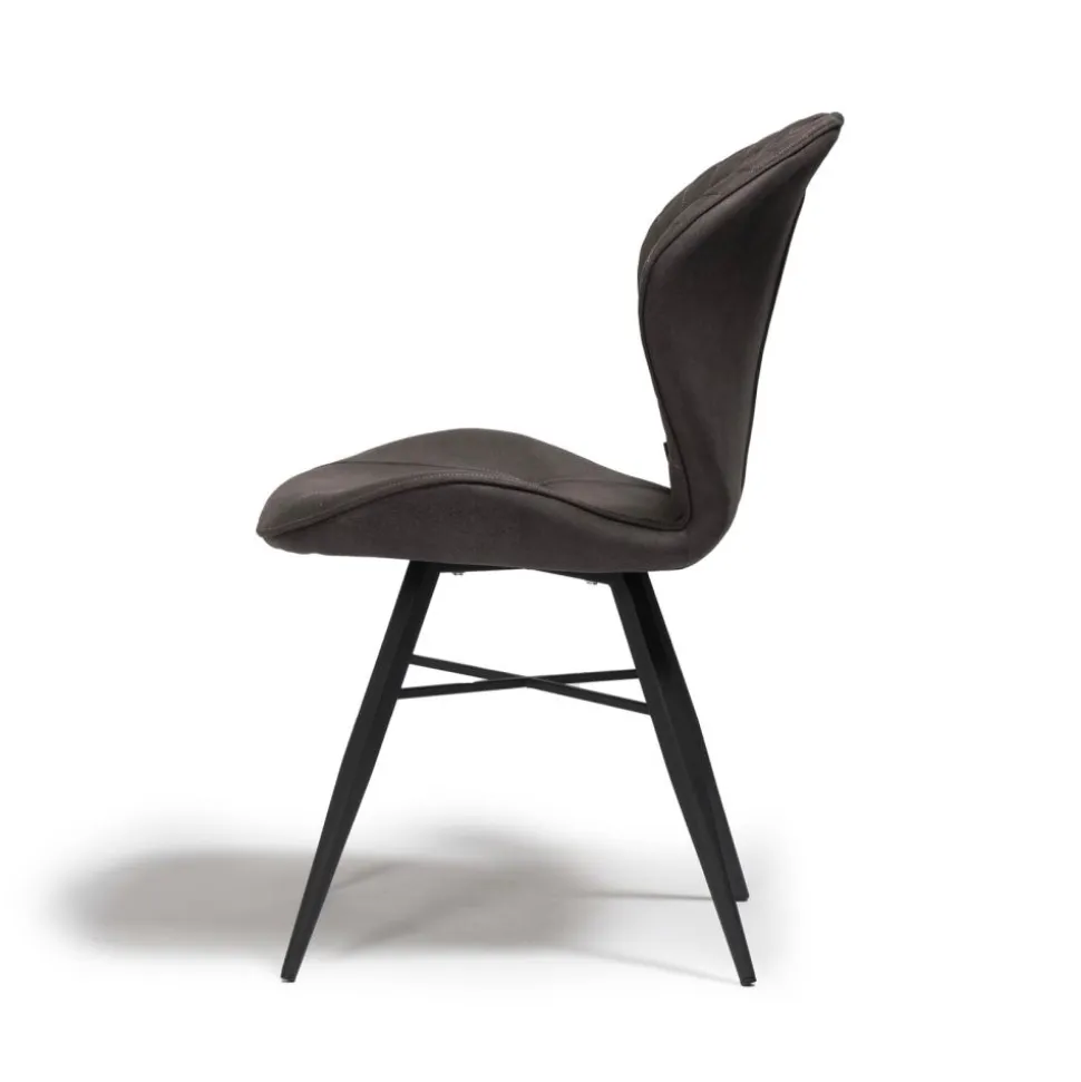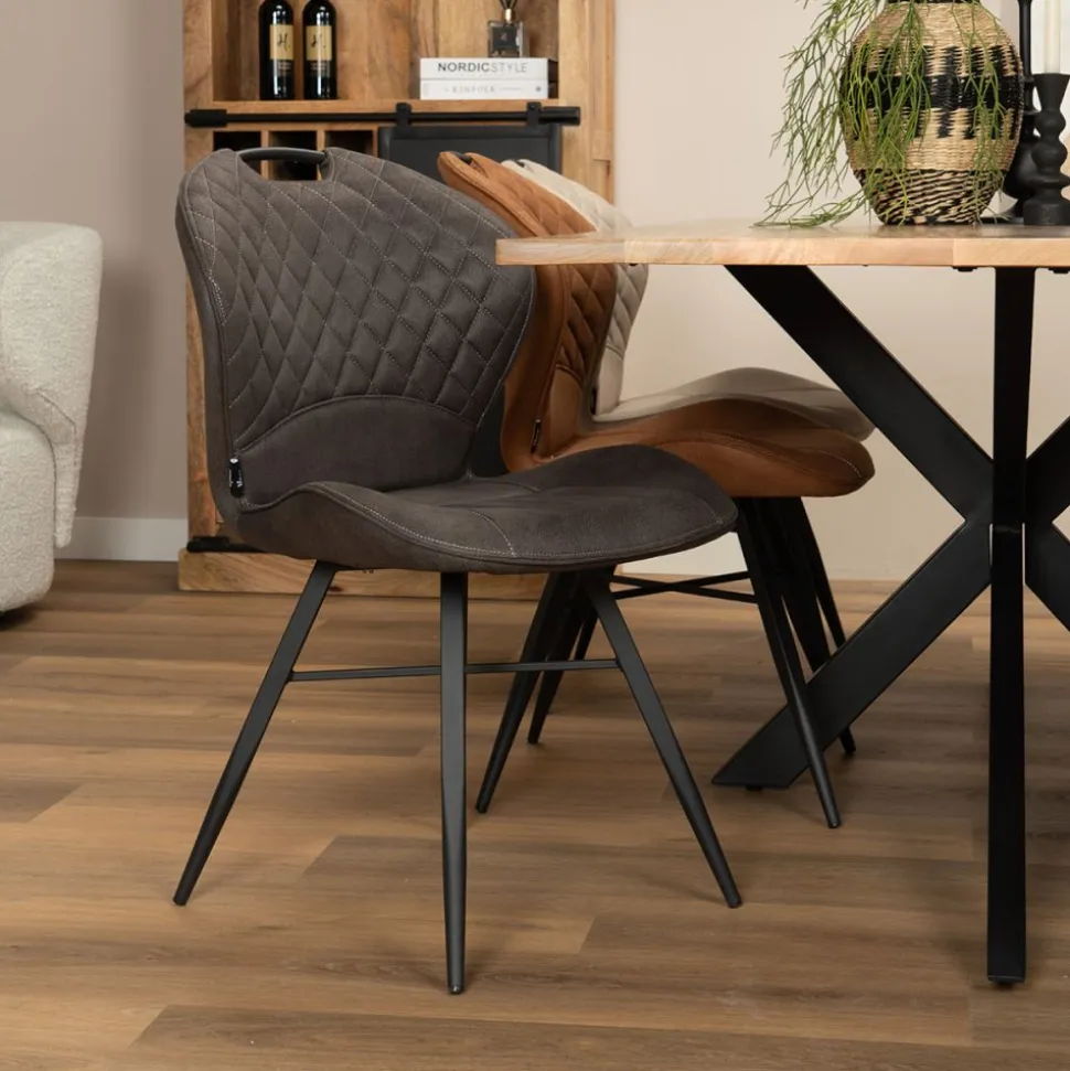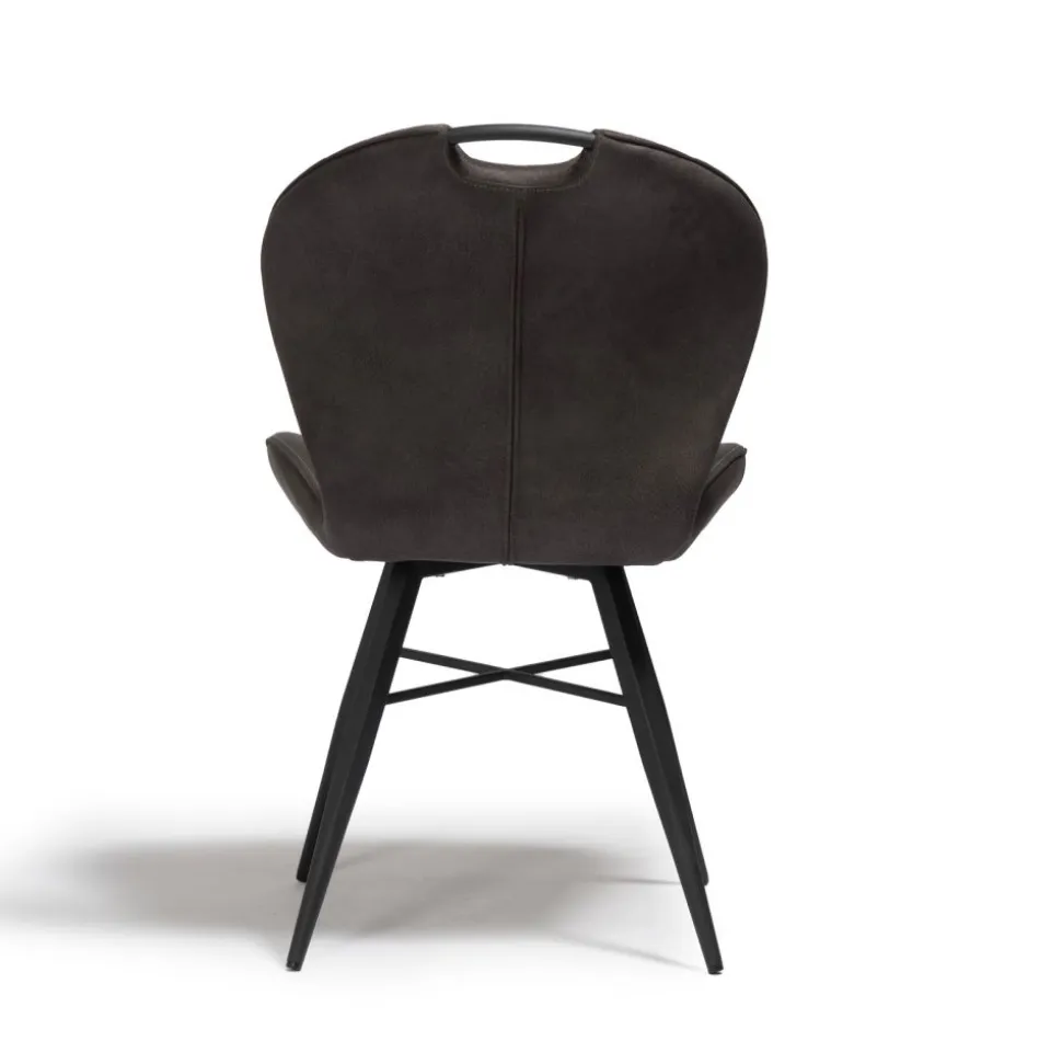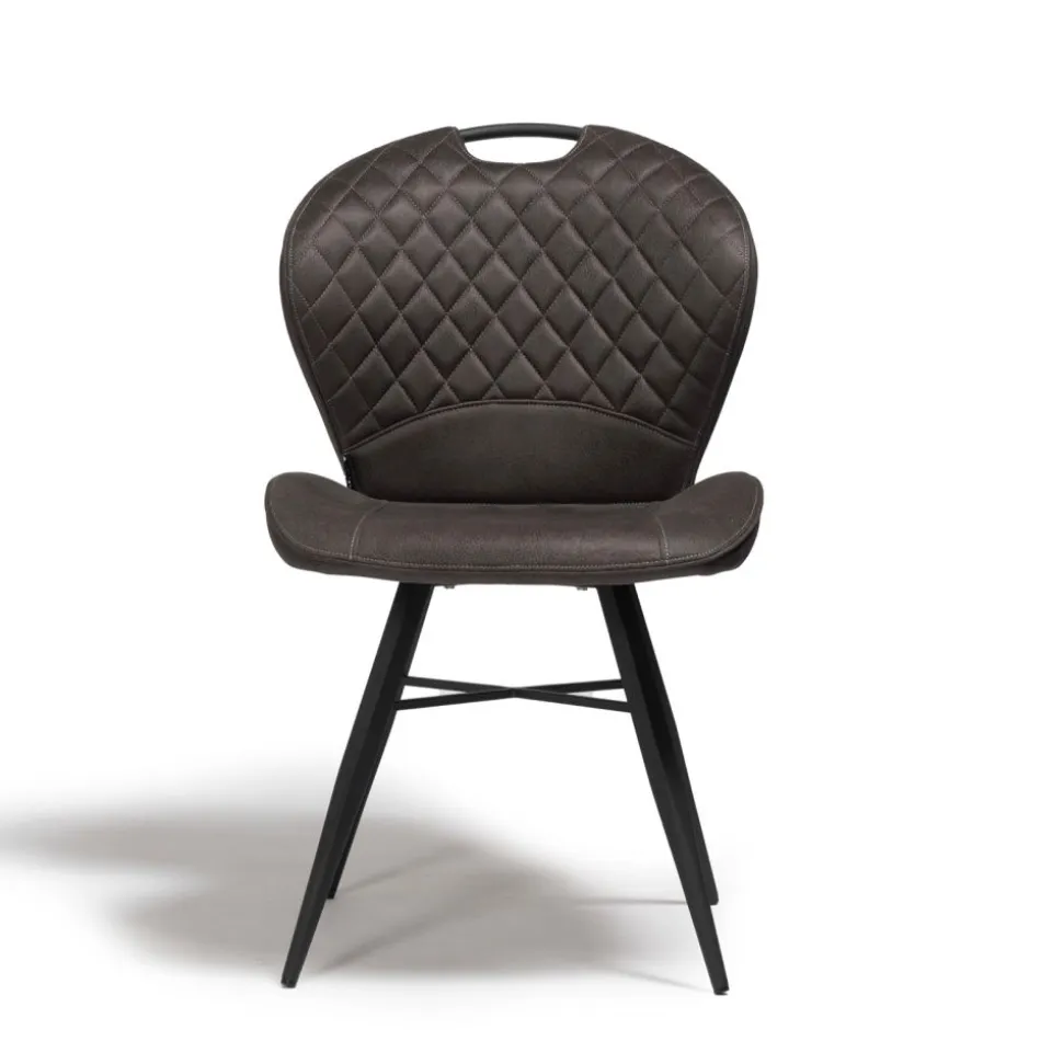Eetkamerstoel Grace is een klassieke stoel met fraai carré stiksel in de rugleuning. De stoel is uitgevoerd in een zachte stof met daarin een patroon dat lijkt op suède. Deze luxe eetkamerstoel is voorzien van een handvat in de rugleuning en heeft zwart metalen poten.