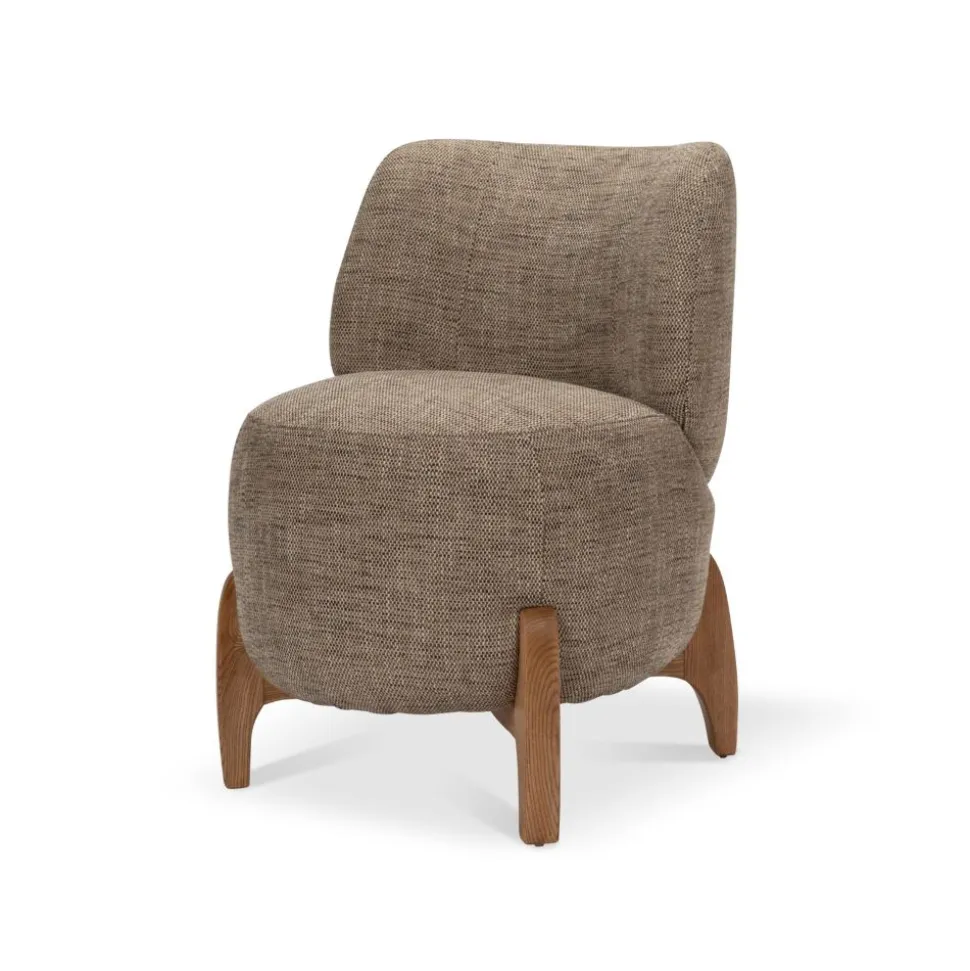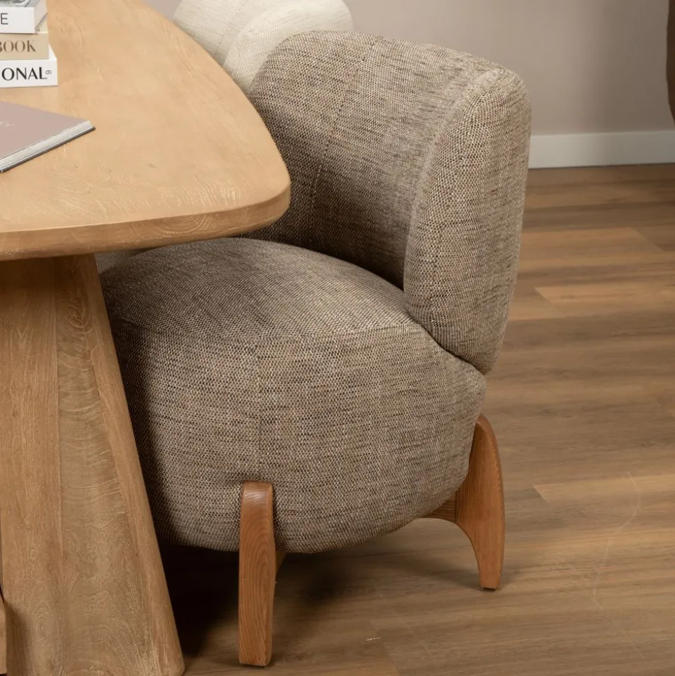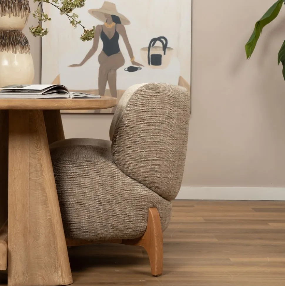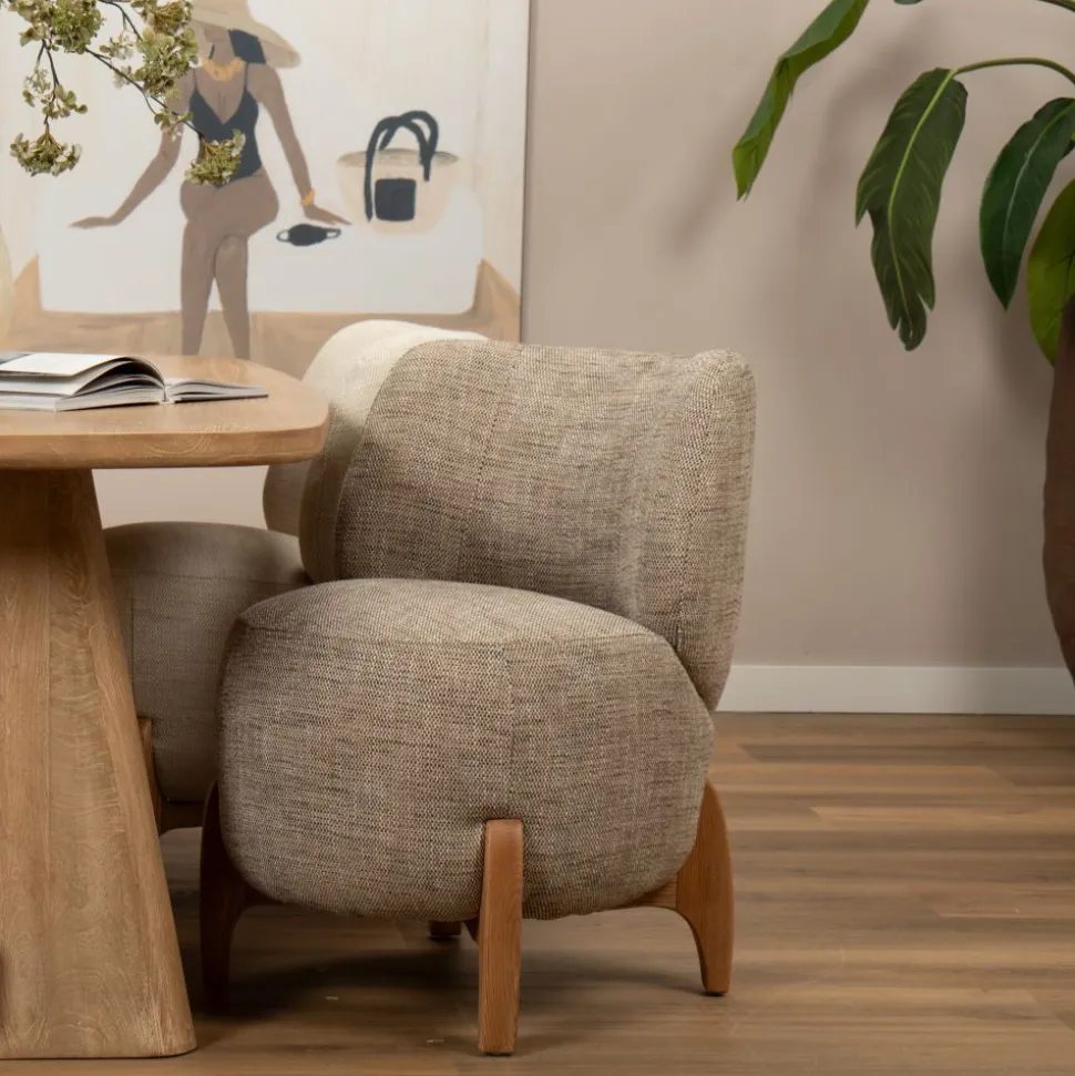 Eetkamerstoel Joy heeft een warme en natuurlijke uitstraling met een speels, rond design. De zachte vormen en de combinatie van stof en hout zorgen voor een rustige en uitnodigende look die perfect past in een modern of Scandinavisch interieur.