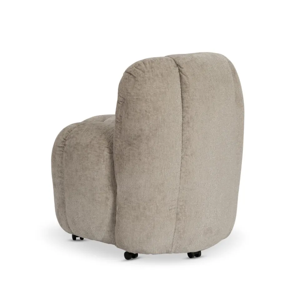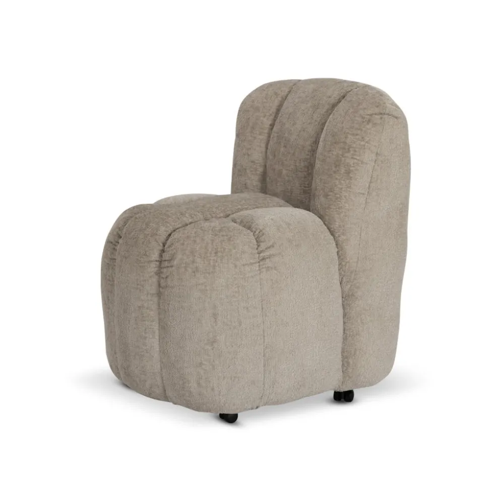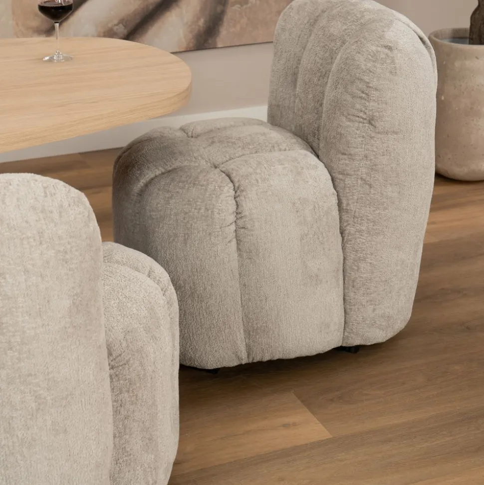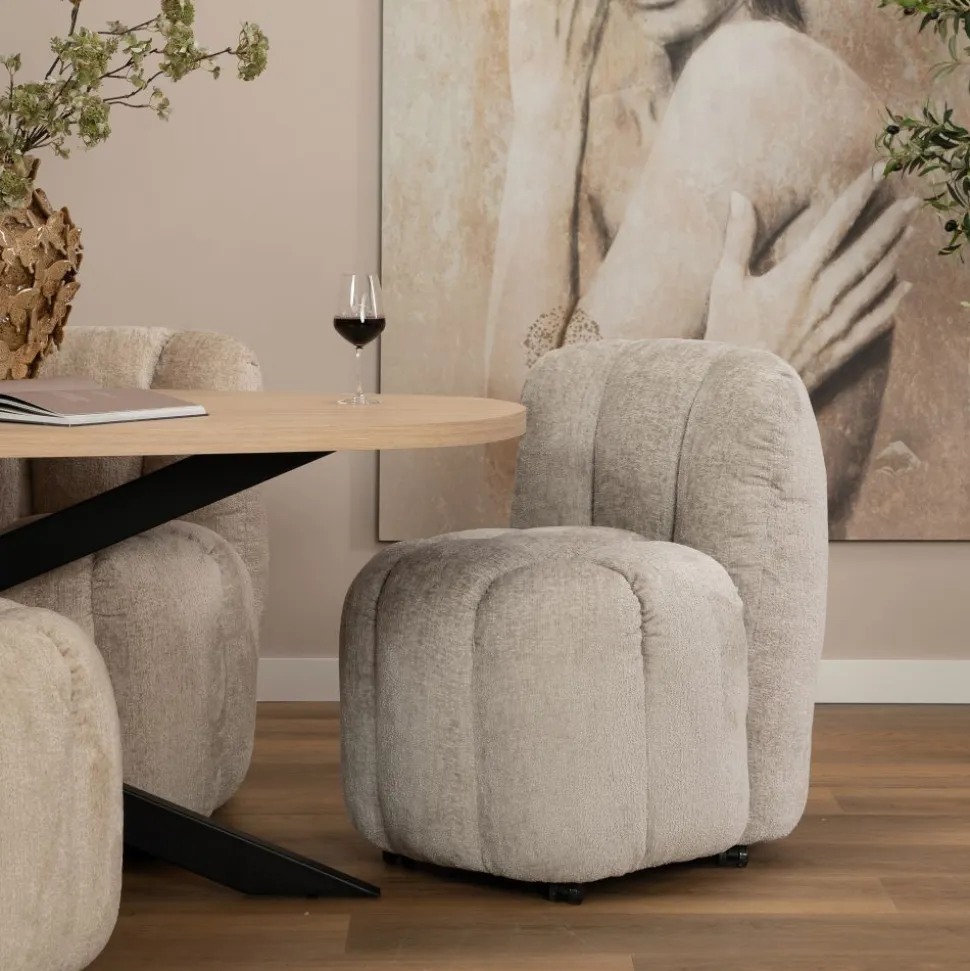 Eetkamerstoel Liva combineert comfort en functionaliteit. De afgeronde vormen en de rijk gestoffeerde zitting zorgen voor een uitnodigende look en een prettig zitcomfort, ideaal voor lange avonden aan tafel. De wieltjes maken het eenvoudig om de stoel soepel onder de tafel te schuiven en weer aan te schuiven wanneer dat nodig is.