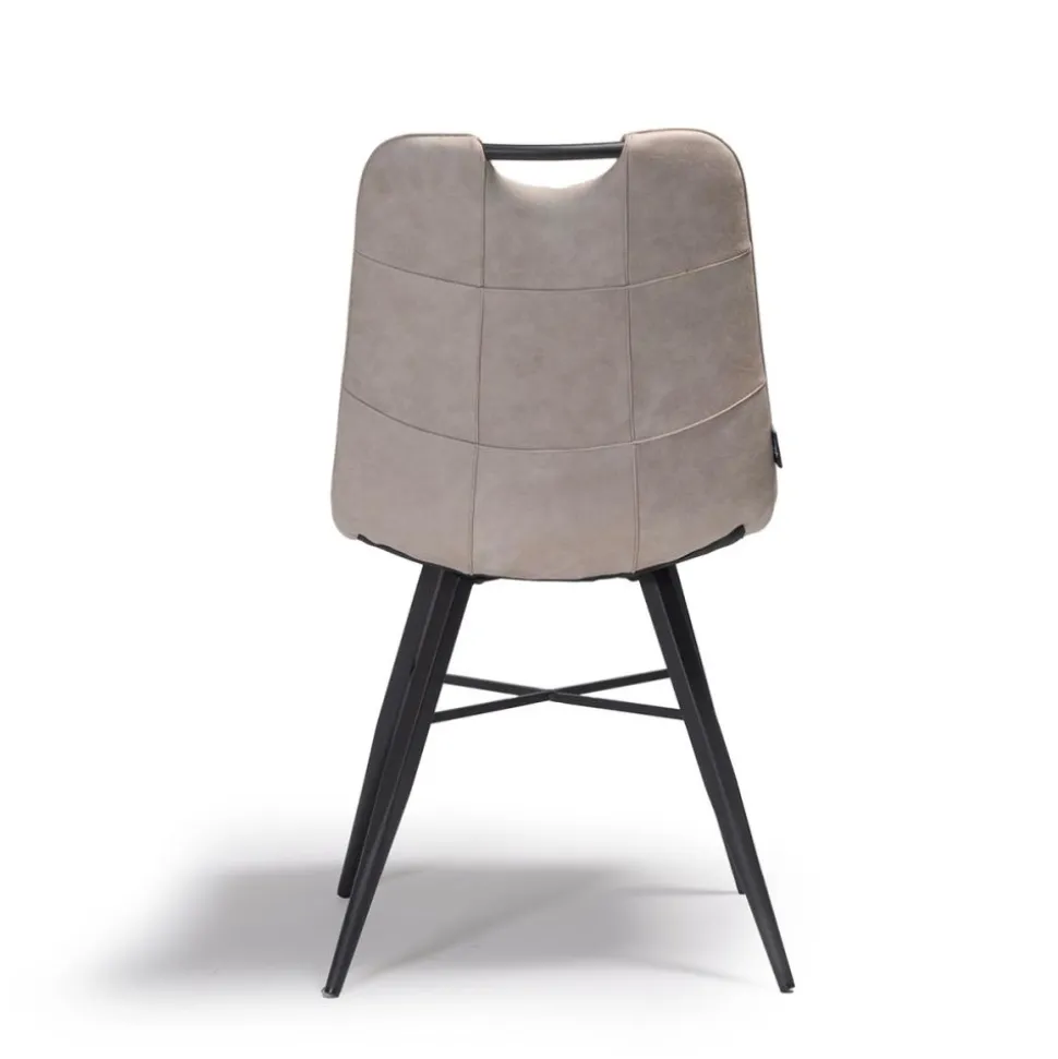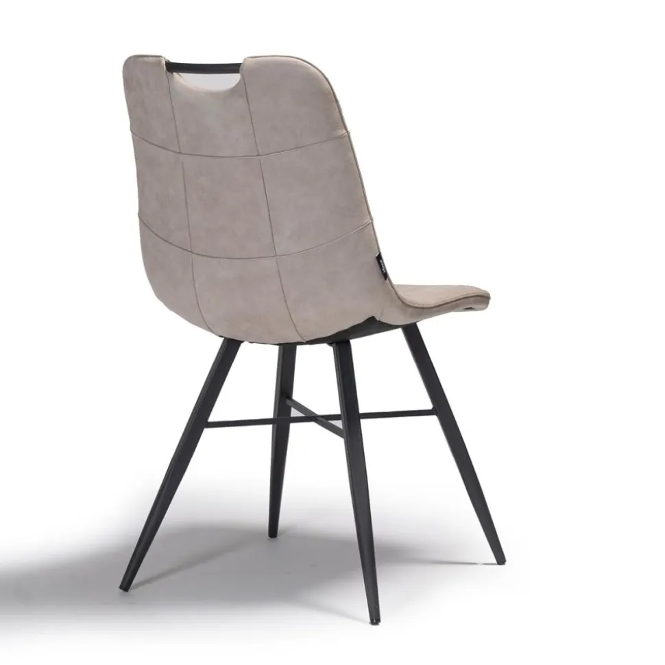 Eetkamerstoel Roady is een moderne stoel met fraai stiksel en een handvat in de rugleuning. De stoel is uitgevoerd in een zachte stof met daarin een patroon dat lijkt op suède. Deze luxe eetkamerstoel is voorzien van zwart metalen poten.
