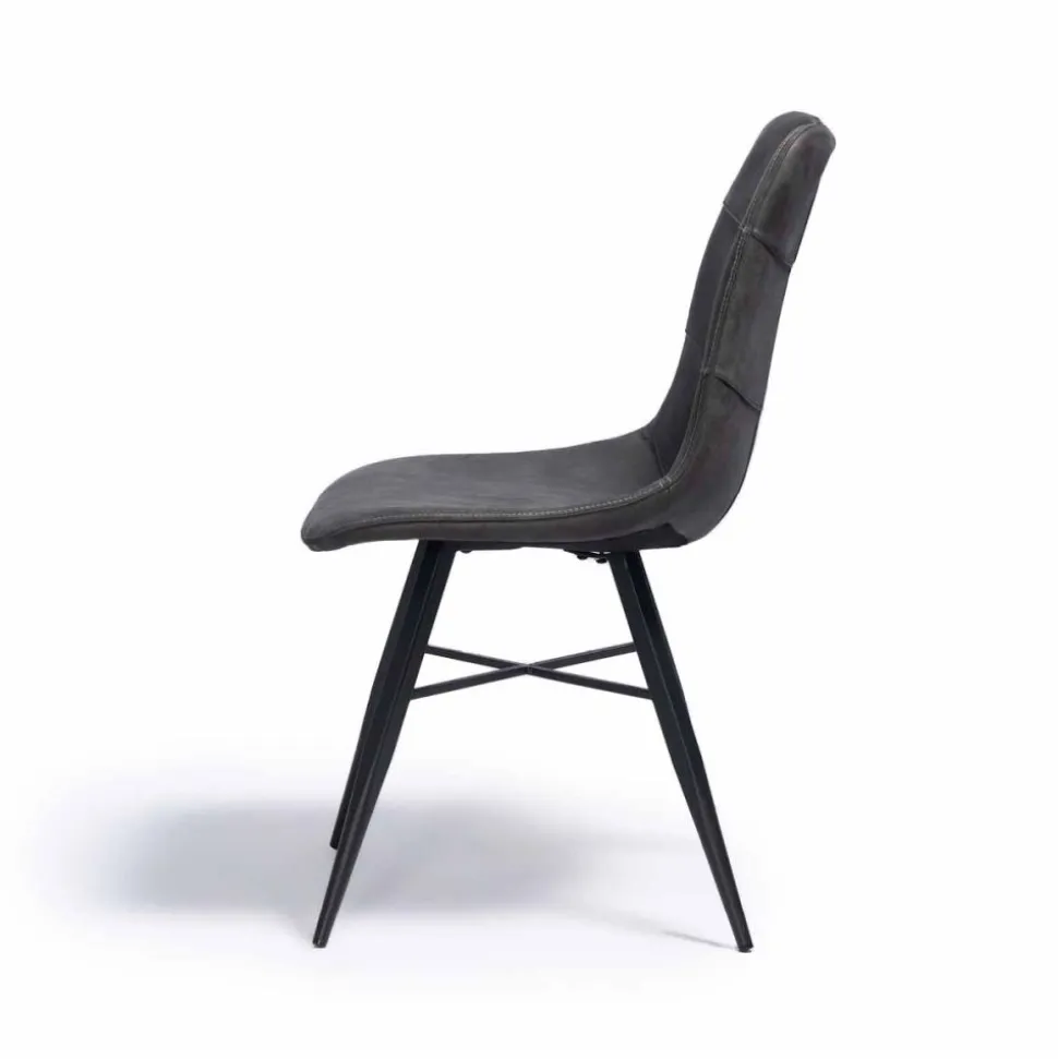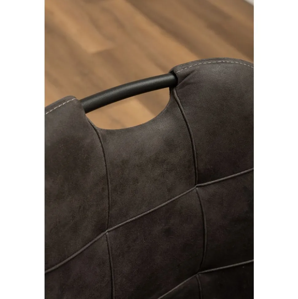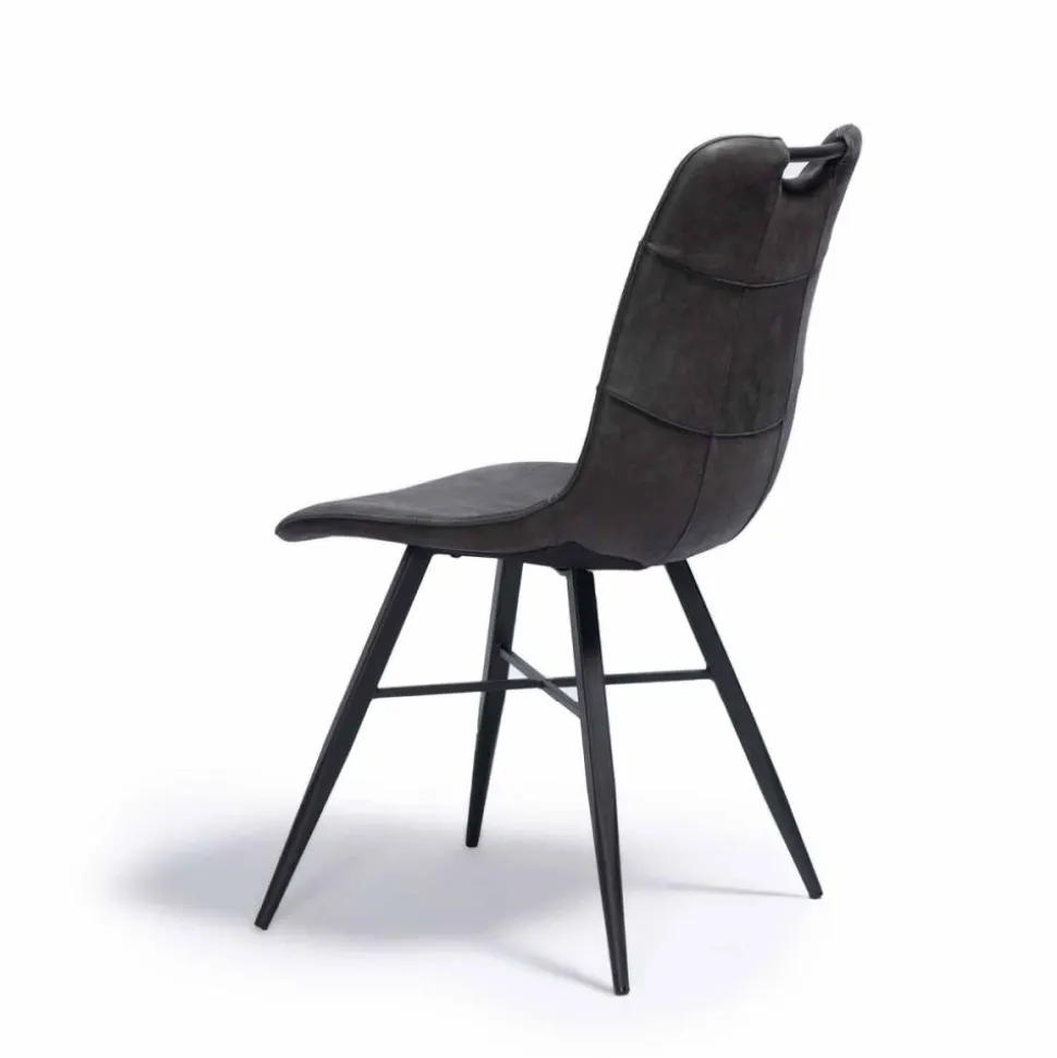 Eetkamerstoel Roady is een moderne stoel met fraai stiksel en een handvat in de rugleuning. De stoel is uitgevoerd in een zachte stof met daarin een patroon dat lijkt op suède. Deze luxe eetkamerstoel is voorzien van zwart metalen poten.