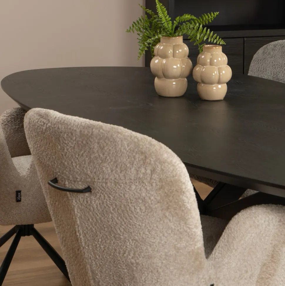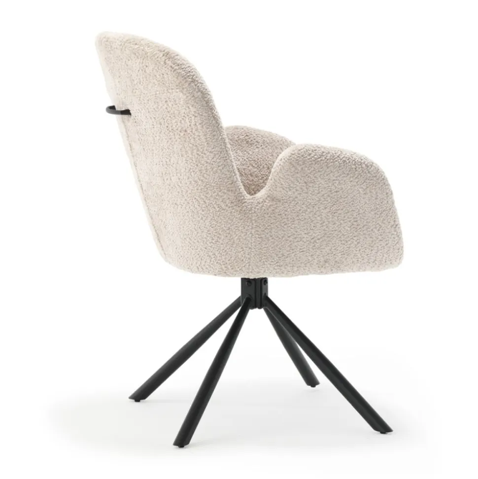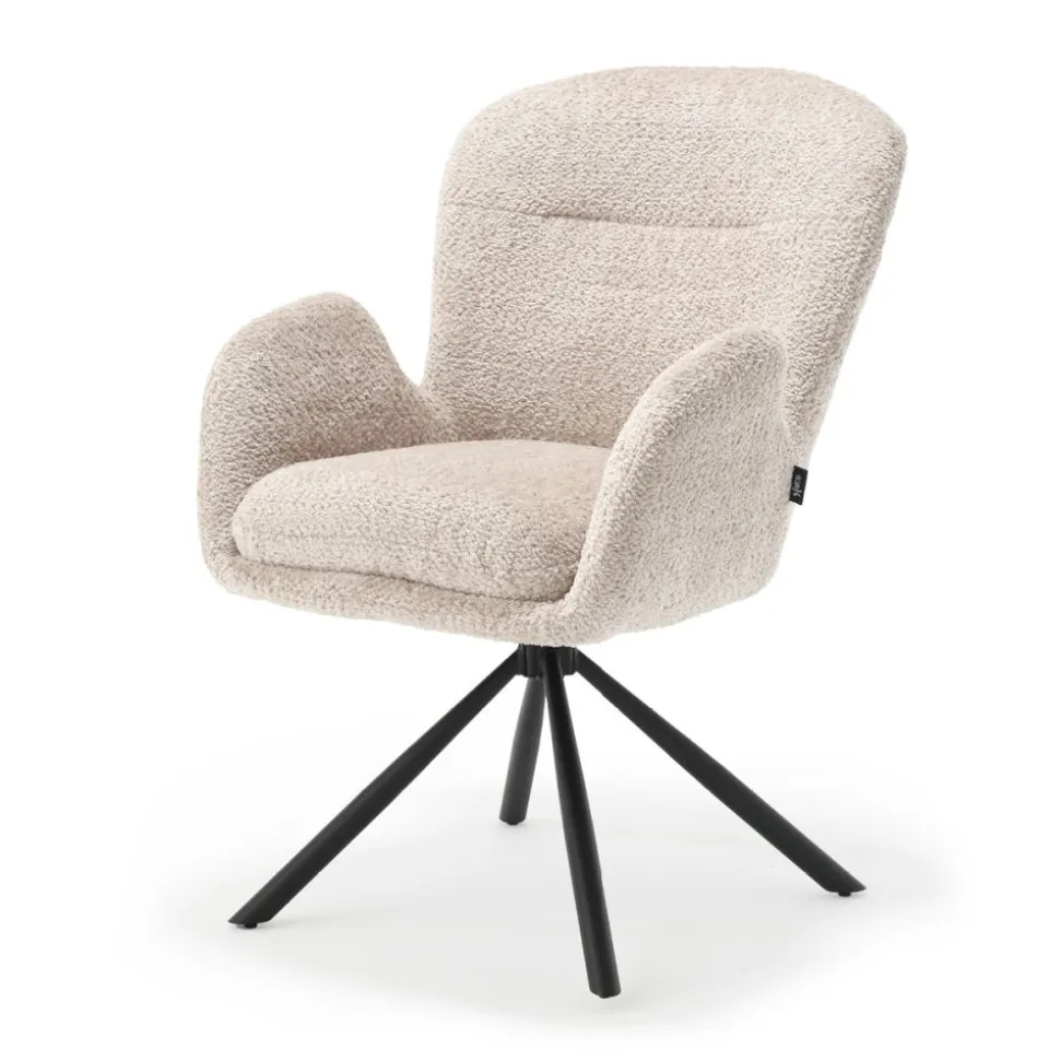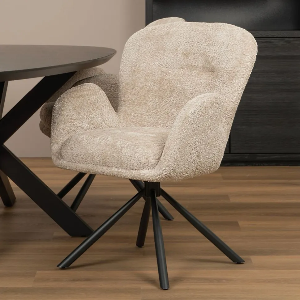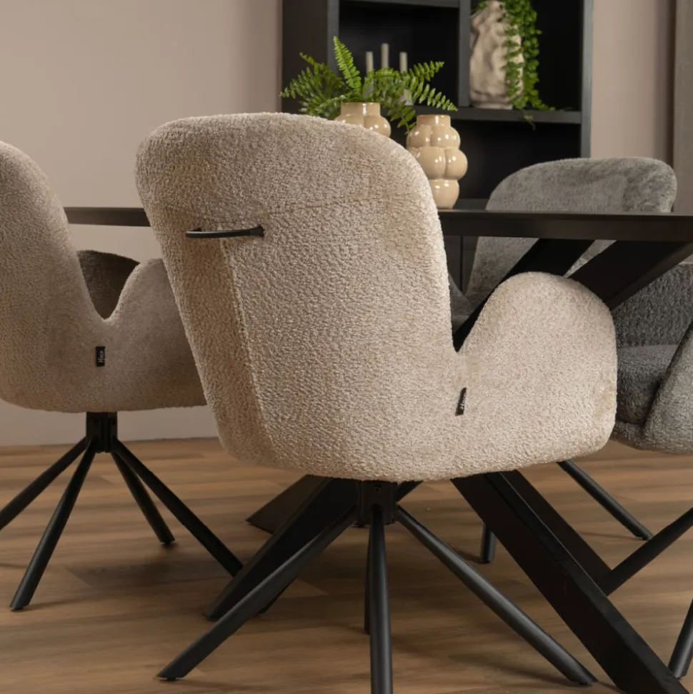Onze eetkamerstoel Tessa is uitgevoerd in verschillende stoffen. Deze geweldige stoel móét je uitproberen, want zo lekker heb je nog nooit gezeten aan je eettafel! De stoel heeft een stoere kruispoot en een gaaf stiksel in de zit- en rugleuning. Tessa is verkrijgbaar in 2 kleuren. De stoel is zowel linksom als rechtsom 90° draaibaar.