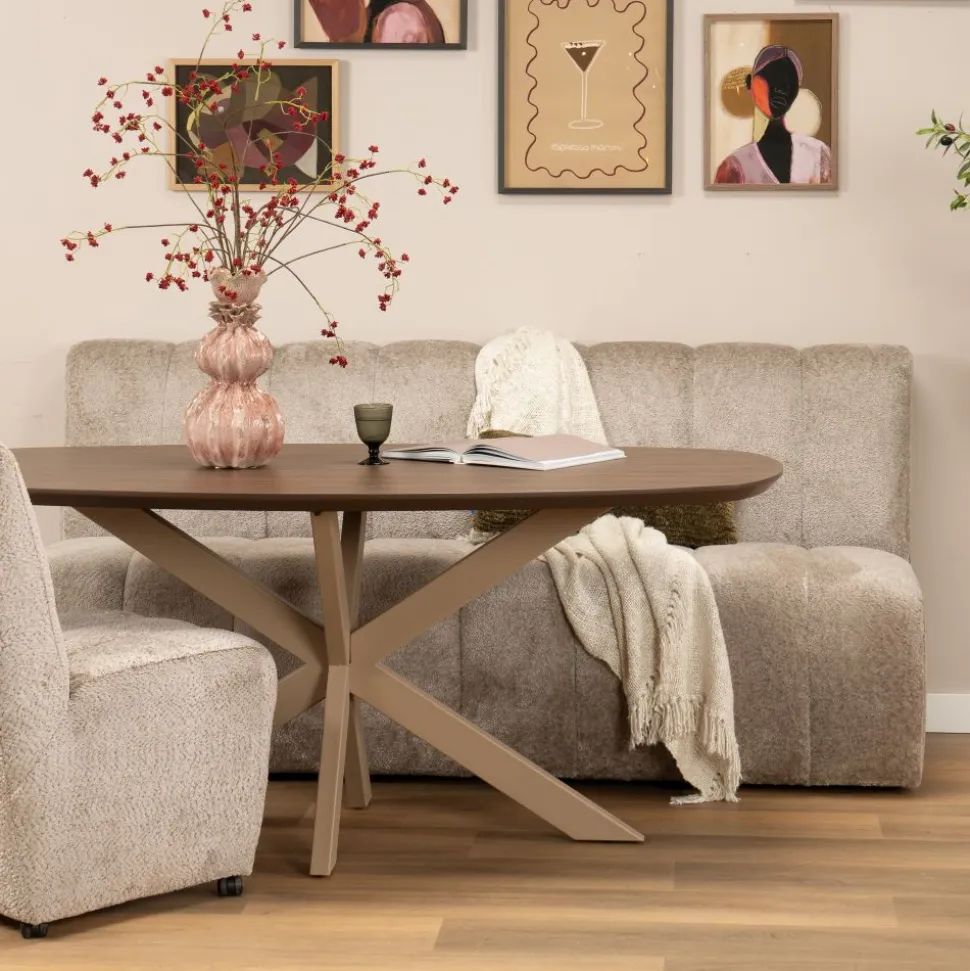 Bruce is een trendy, Deense ovale tafel gemaakt van melamine. Het tafelblad is verjongd, heeft een gave, walnoot kleur en rust op een stoere, metalen spinpoot. De eettafel is verkrijgbaar in meerdere maten en meerdere kleuren.