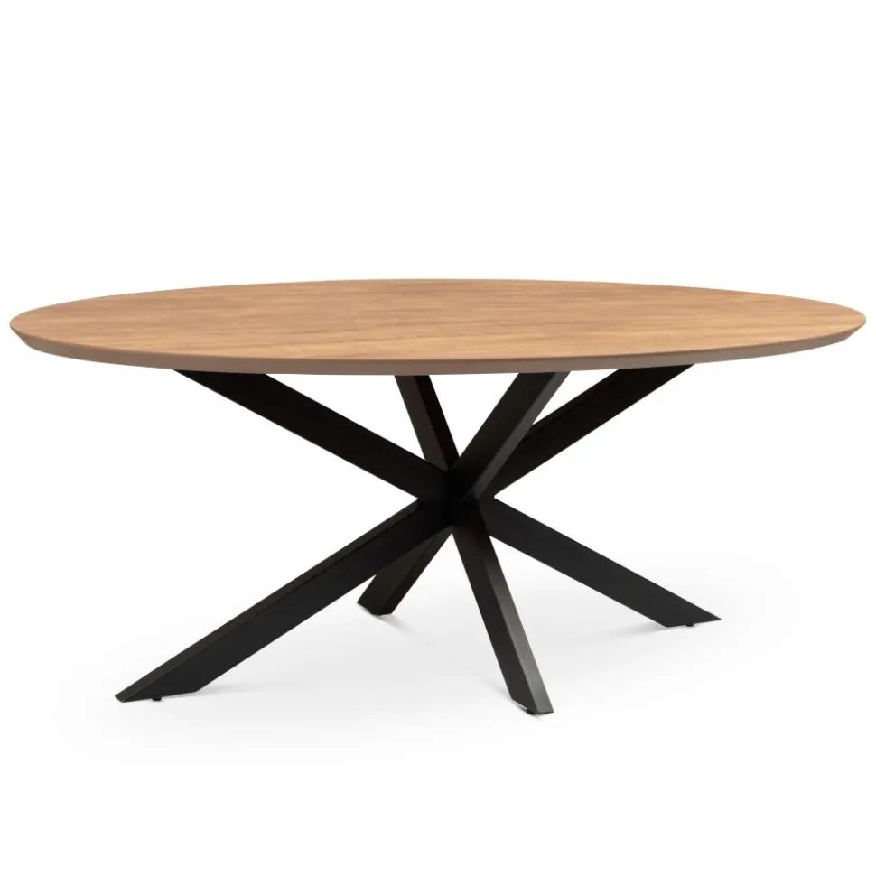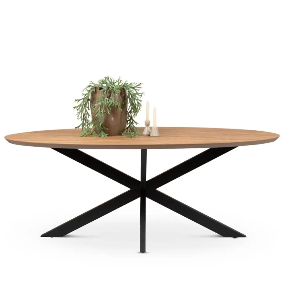 George is een trendy, ovale eettafel gemaakt van melamine. Het tafelblad is verjongd, heeft een gave, mango kleur en rust op een stoere, metalen spinpoot. De eettafel is verkrijgbaar in vijf maten en meerdere kleuren.