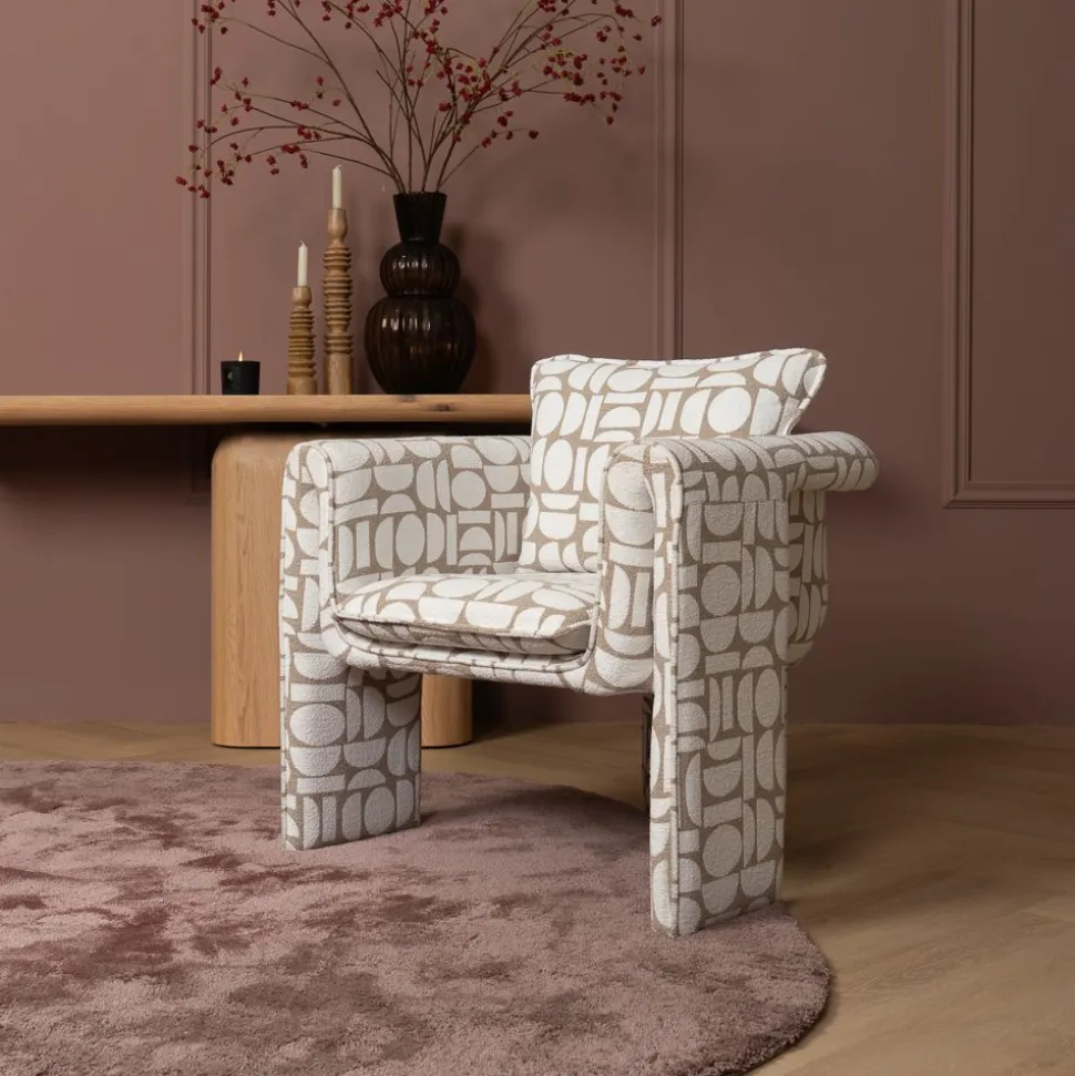 Fauteuil Romee is een echte eyecatcher dankzij het unieke grafische patroon in zachte, neutrale tinten. De afgeronde vormen en de royale zit en rugkussen zorgen voor een heerlijk comfortabele zit. Perfect om te ontspannen met een goed boek of een kop koffie.