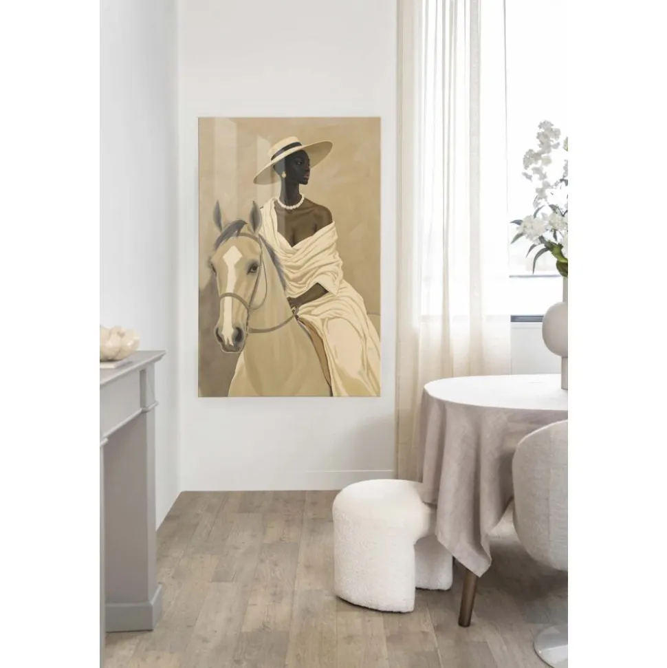 Een stijlvol schilderij met een elegante vrouw te paard. De zachte aardetinten en verfijnde details geven het kunstwerk een luxe en tijdloze uitstraling. Perfect als indrukwekkende blikvanger in een modern of klassiek interieur. Uitgevoerd als glazen schilderij, wat zorgt voor een strakke uitstraling.