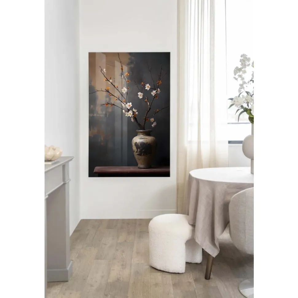 Dit schilderij toont een verfijnde compositie van bloesemtakken in een klassieke vaas. De combinatie van warme aardetinten, donkere achtergrond en zachte bloesems creëert een harmonieus en sfeervol geheel. Een stijlvol kunstwerk dat rust en elegantie brengt in elke woonruimte. Uitgevoerd als glazen schilderij, wat zorgt voor een strakke uitstraling.