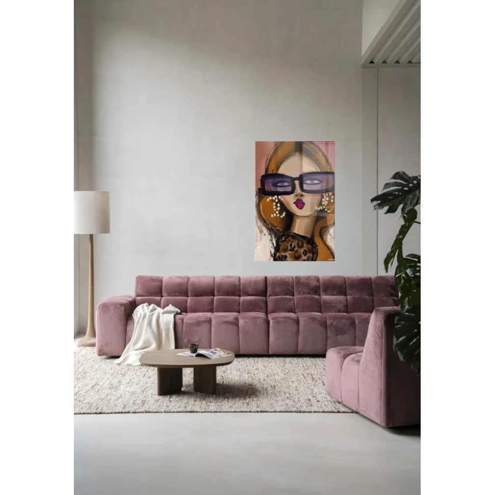 Een trendy schilderij met een modieus portret en opvallende accessoires. De combinatie van warme tinten, speelse details en een artistieke stijl maakt dit kunstwerk een echte blikvanger in elk modern interieur. Uitgevoerd als glazen schilderij, wat zorgt voor een strakke uitstraling.