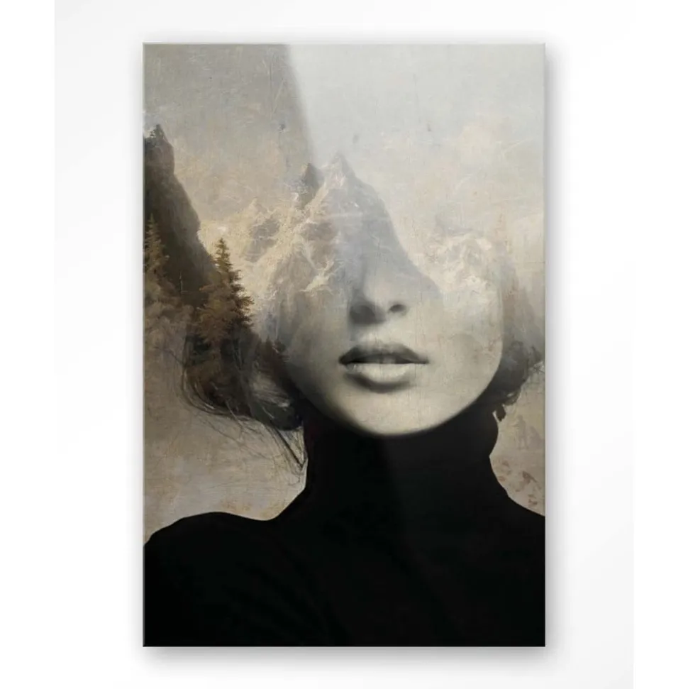 Een gezicht gecombineerd met een berglandschap in zachte aardetinten. Dit kunstwerk brengt een serene en introspectieve sfeer, perfect voor minimalistische interieurs of als focuspunt in een rustige omgeving. Uitgevoerd als glazen schilderij, wat zorgt voor een strakke uitstraling.