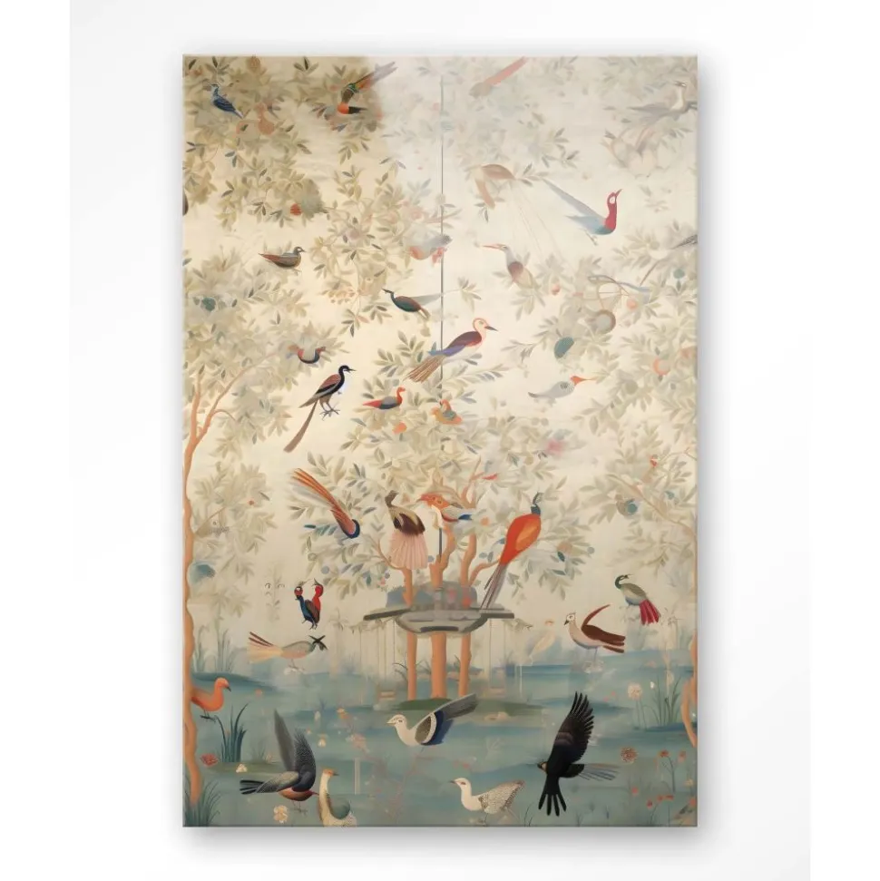 Een prachtig oosters tafereel met delicate vogels en tempels in zachte pasteltinten. De gedetailleerde bomen en serene ambiance maken dit werk een rustpunt in elke ruimte. Uitgevoerd als glazen schilderij, wat zorgt voor een strakke uitstraling.