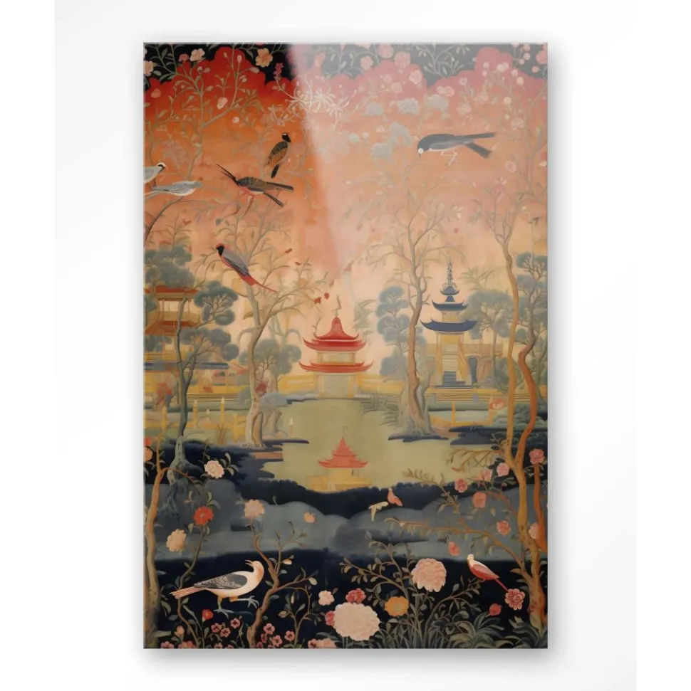 Dit magische nachtelijke oosterse landschap combineert diepe oranjerode tinten met silhouetten van vogels en tempels. Ideaal voor een mysterieuze en warme sfeer. Uitgevoerd als glazen schilderij, wat zorgt voor een strakke uitstraling.