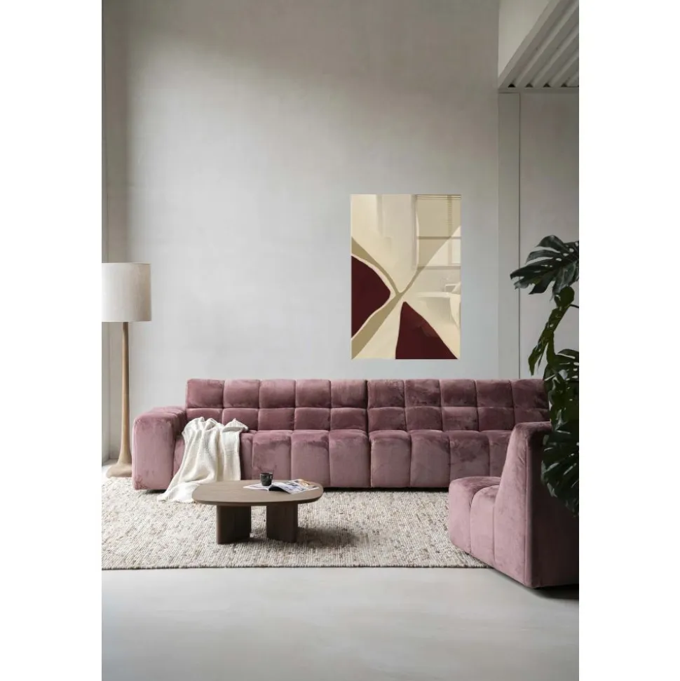 Vloeiende abstracte vormen in een neutraal kleurenpalet van beige en bordeaux creëren een verfijnde compositie. Dit schilderij straalt elegantie en eenvoud uit en past perfect bij een modern interieur. Uitgevoerd als glazen schilderij, wat zorgt voor een strakke uitstraling.